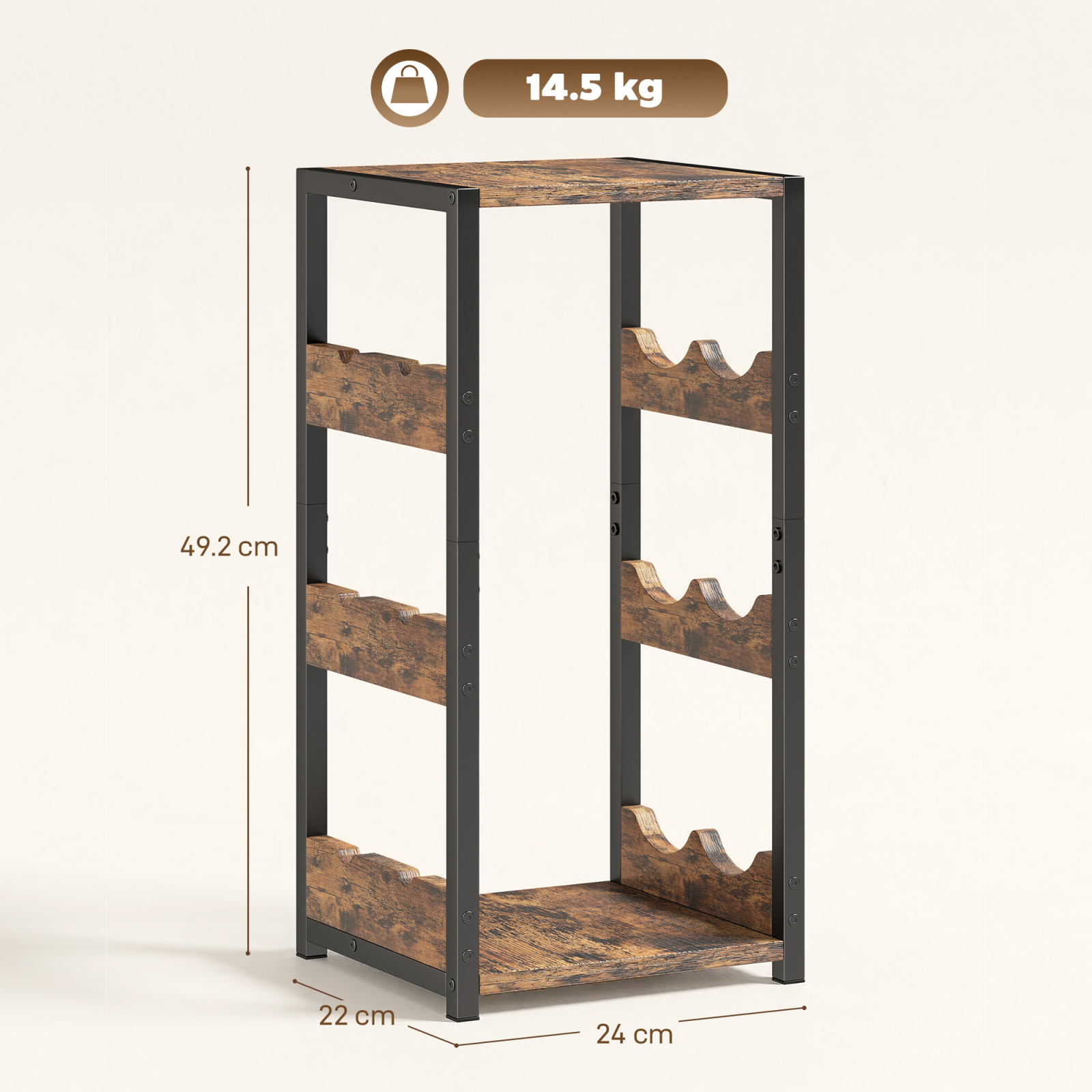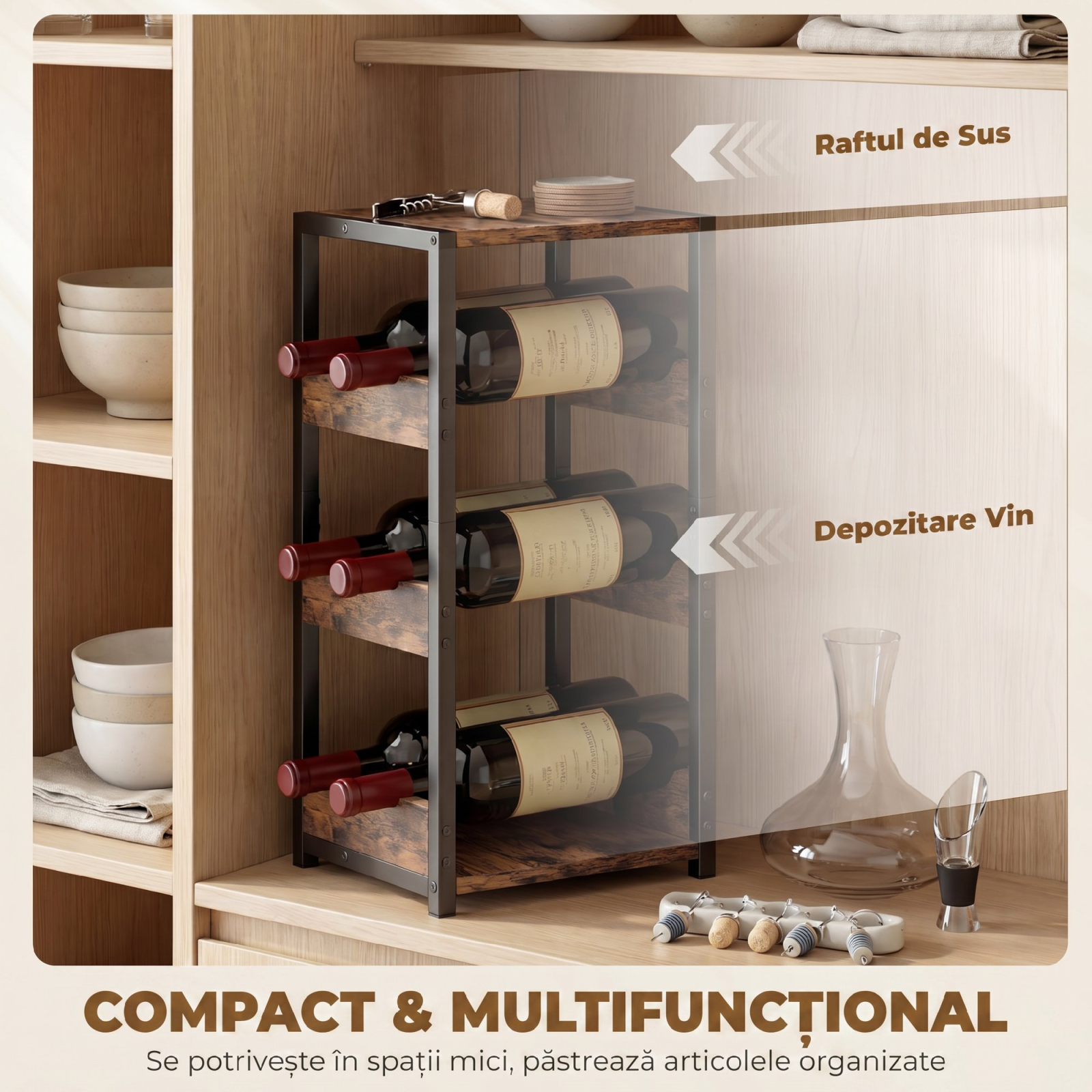 Colectia ta iubita de vinuri a devenit un haos in spatiul tau mic? Sticlele aluneca pe rafturi si paharele nu isi gasesc niciodata locul. Cu suportul pentru sticle [BRAND NAME], problema este rezolvata! Design compact si industrial care functioneaza si ca o masuta de colt eleganta. Rafturi ondulate pentru sase sticle si o suprafata superioara perfecta pentru organizarea a tot ce ai nevoie pentru o seara relaxanta.