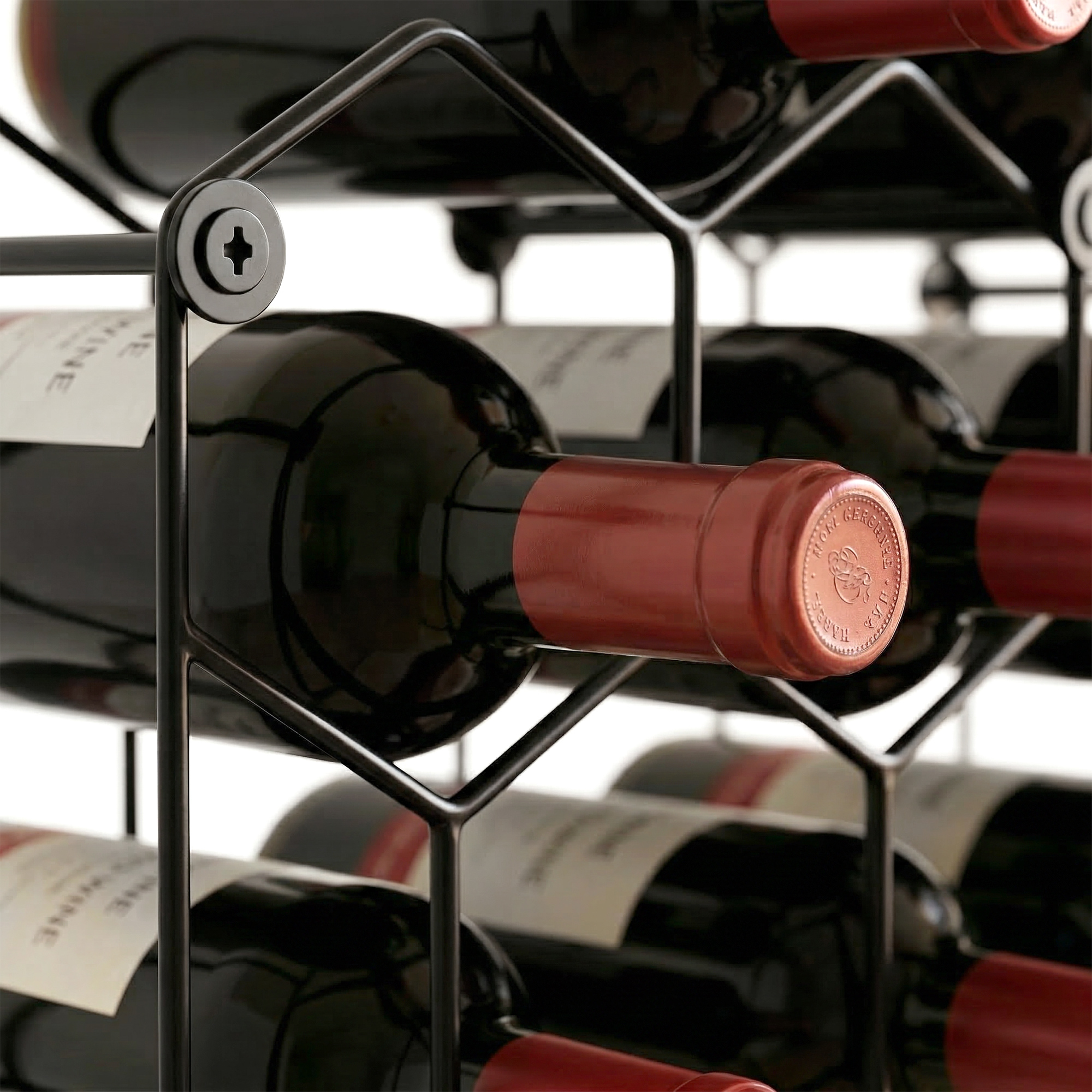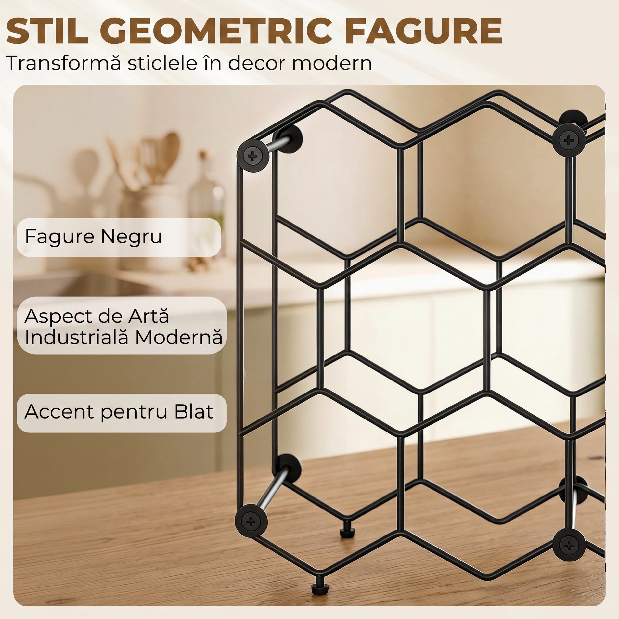 Colectia ta de vinuri creeaza dezordine in loc sa reflecte stilul tau? Acest lucru poate strica estetica casei tale, mai ales in spatii restranse. Suportul de sticle [BRAND NAME], cu designul sau elegant in forma de fagure, rezolva aceasta problema. Fabricat complet din metal, poate stoca pana la 13 sticle in siguranta si compact, transformandu-se intr-un element decorativ modern care infrumuseteaza bucataria sau sufrageria ta.