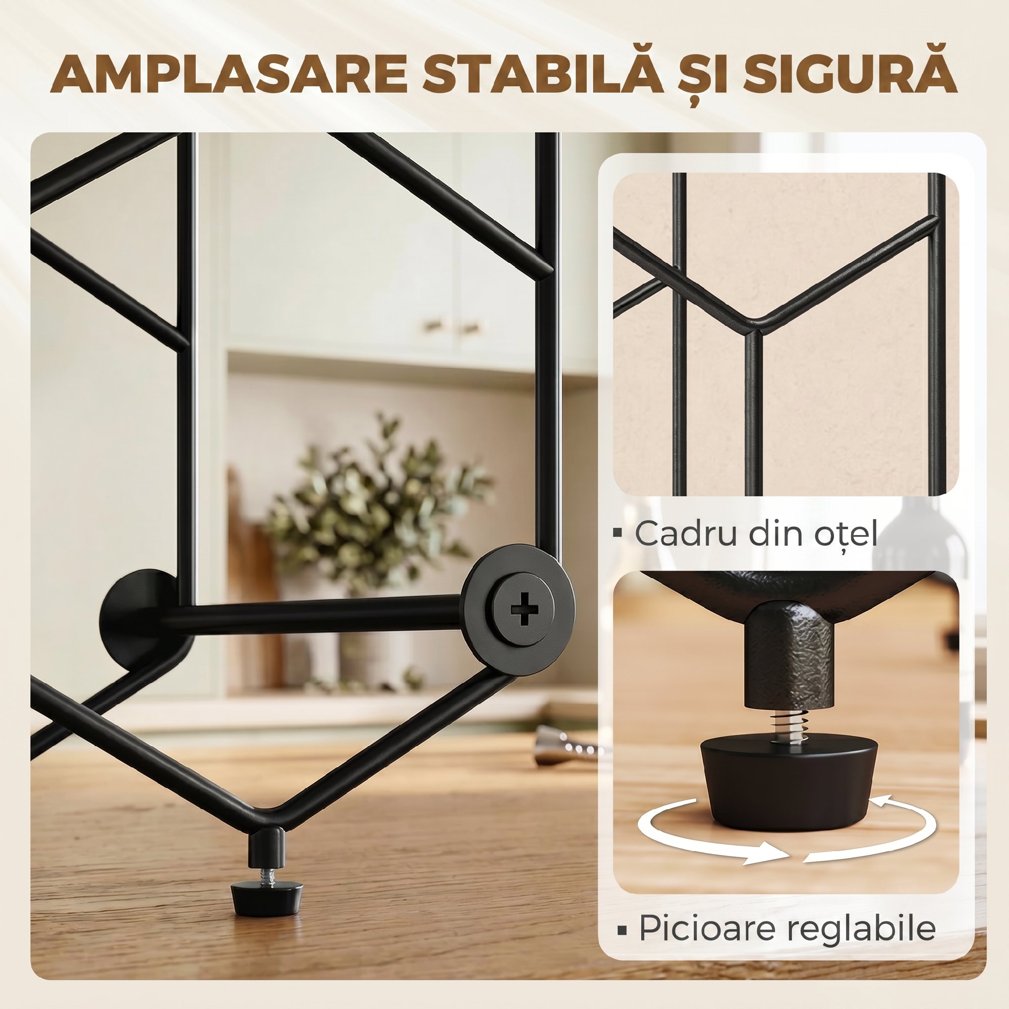 • STABIL sI SIGUR: Picioarele reglabile ale suportului de sticle asigura stabilitatea chiar si pe suprafete inegale, iar cureaua anti-rasturnare inclusa ofera o protectie fiabila impotriva accidentelor, pastrandu-ti vinurile pretioase in siguranta.
