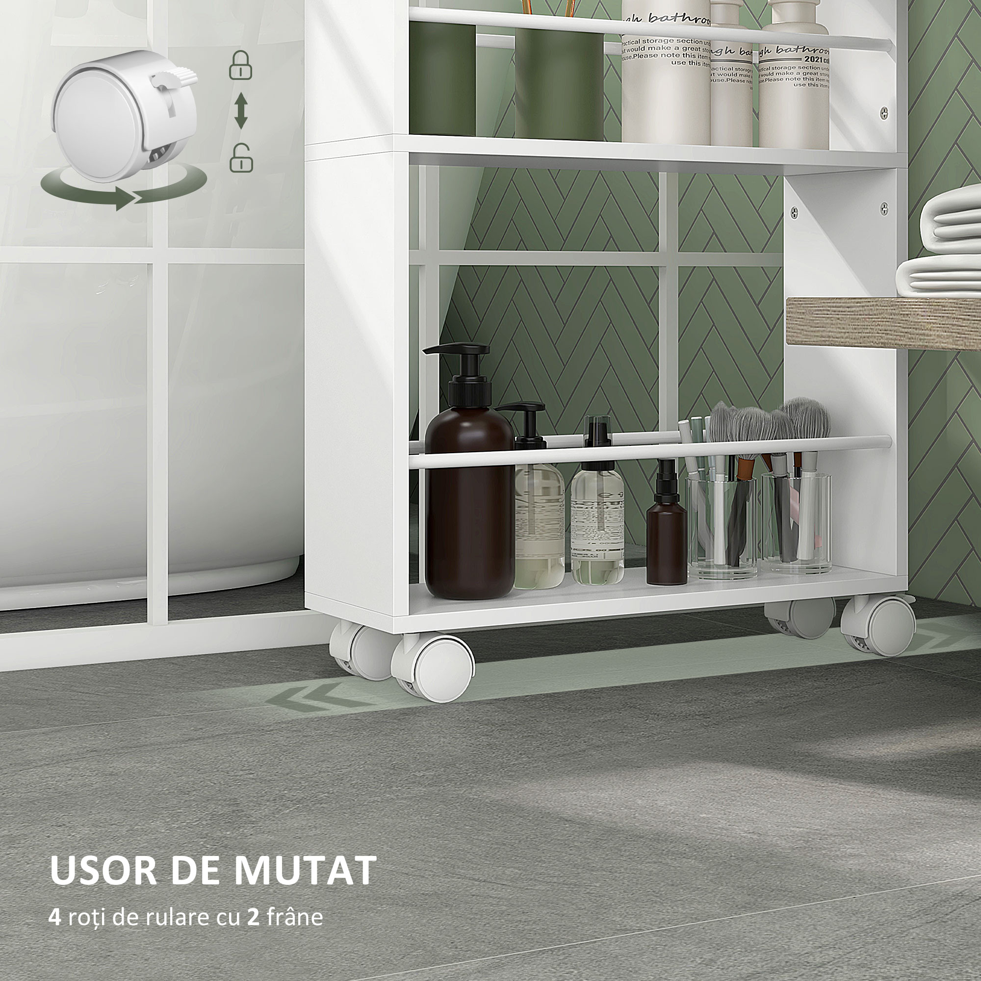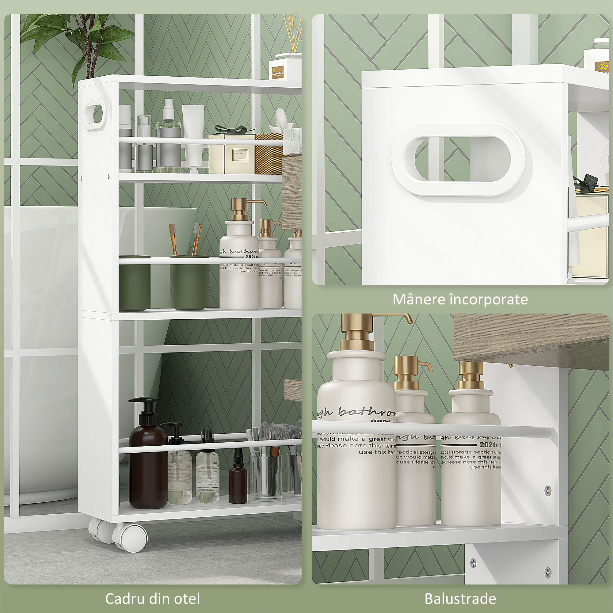 • UsOR DE MUTAT: Echipat cu patru roti, acest raft pentru baie poate fi mutat cu usurinta. Doua roti sunt dotate cu frane pentru a asigura stabilitatea, iar manerele integrate faciliteaza transportul.