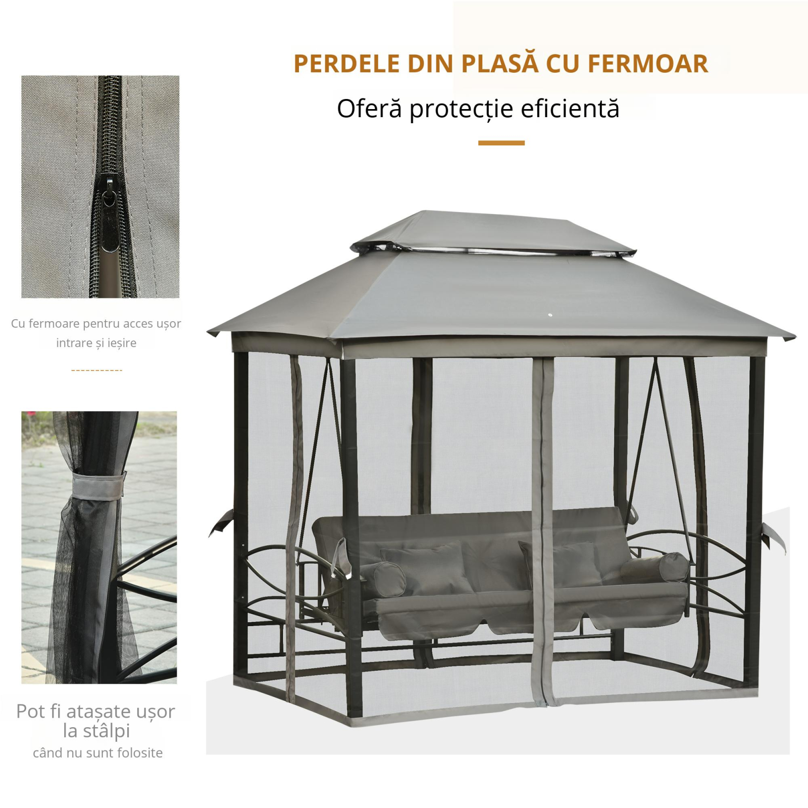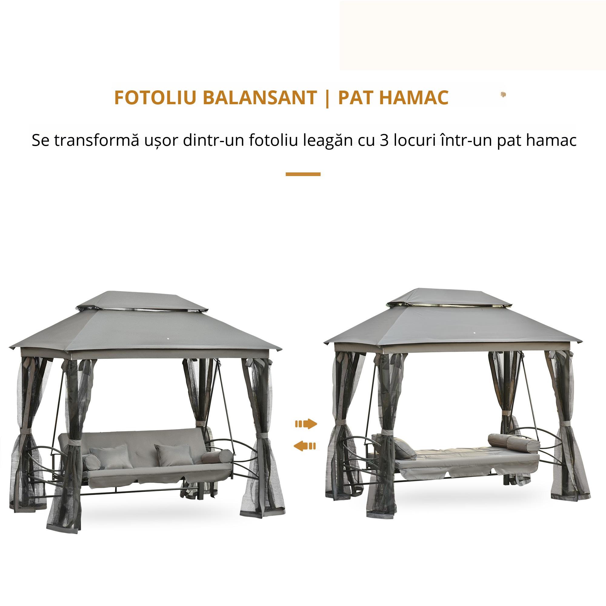 Asezati-va pe acest balansoar de gradina cu foisor [BRAND NAME] si lasati-va mangaiati de zilele insorite. Cadrul de otel este stabil si robust, cu o husa practica din poliester pentru a va proteja de soare. Foisorul cu plasa impotriva tantarilor va tine la adapost de insecte si cu baldachinul sau dublu asigura o ventilatie excelenta. Se pot aseza 3 persoane sau poti transforma balansoarul intr-un pat confortabil, sa te relaxezi in companie sau sa te bucuri singur de momentele de relaxare in aer liber!
