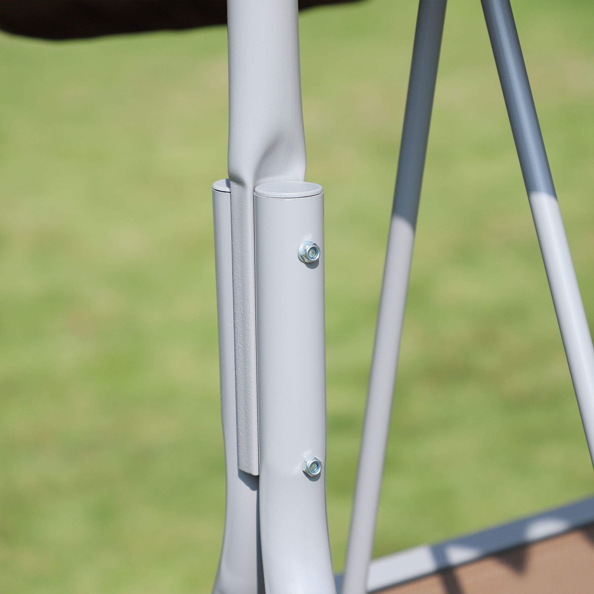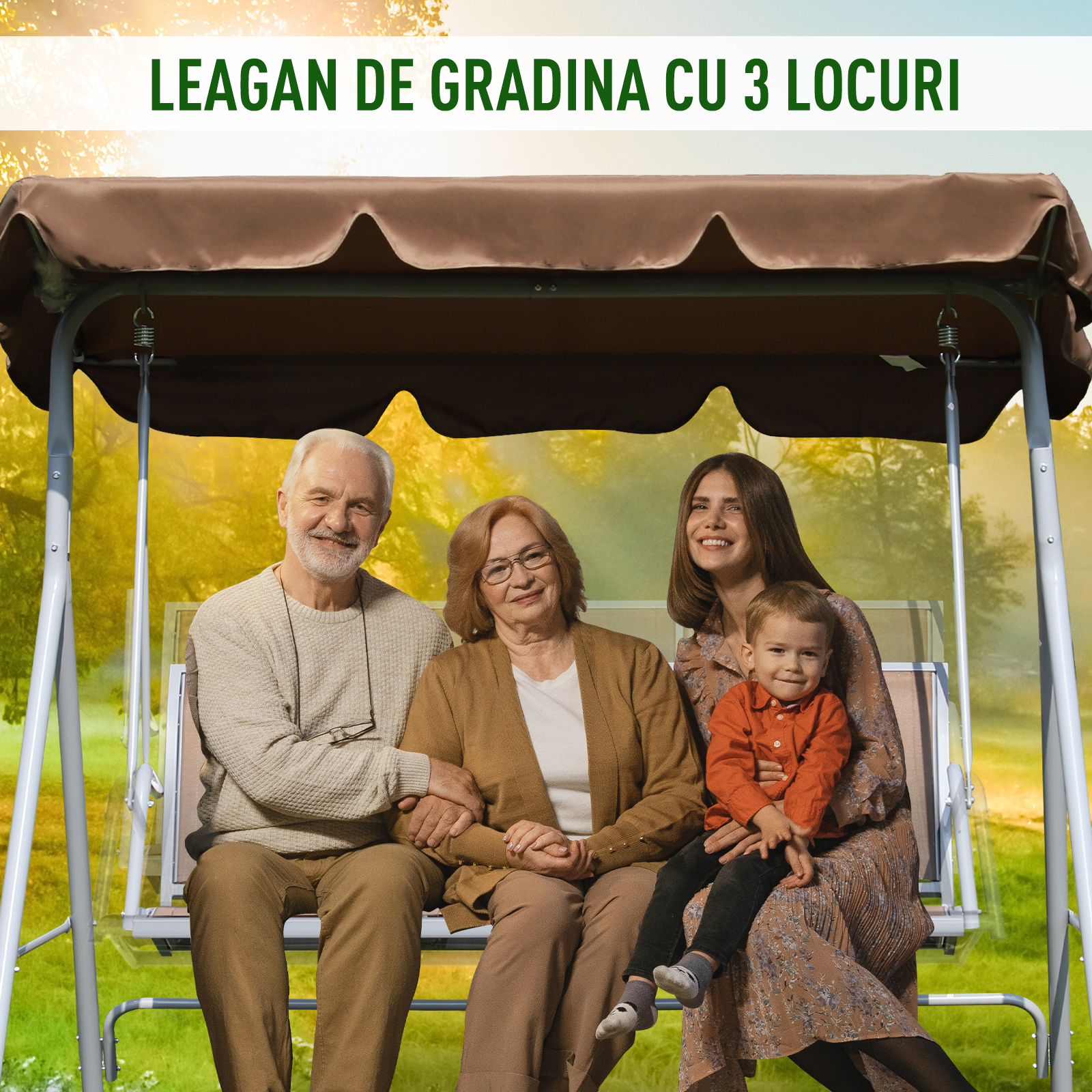 Leaganul cu 3 locuri [BRAND NAME] este decorul perfect pentru a petrece timpul in aer liber impreuna cu prietenii si familia. Realizat cu o structura solida din metal, acest balansoar de gradina este dotat cu o copertina pentru a te proteja de soare. Design-ul minimalist cu culori neutre il face mai elegant, este compatibil cu orice decor exterior.