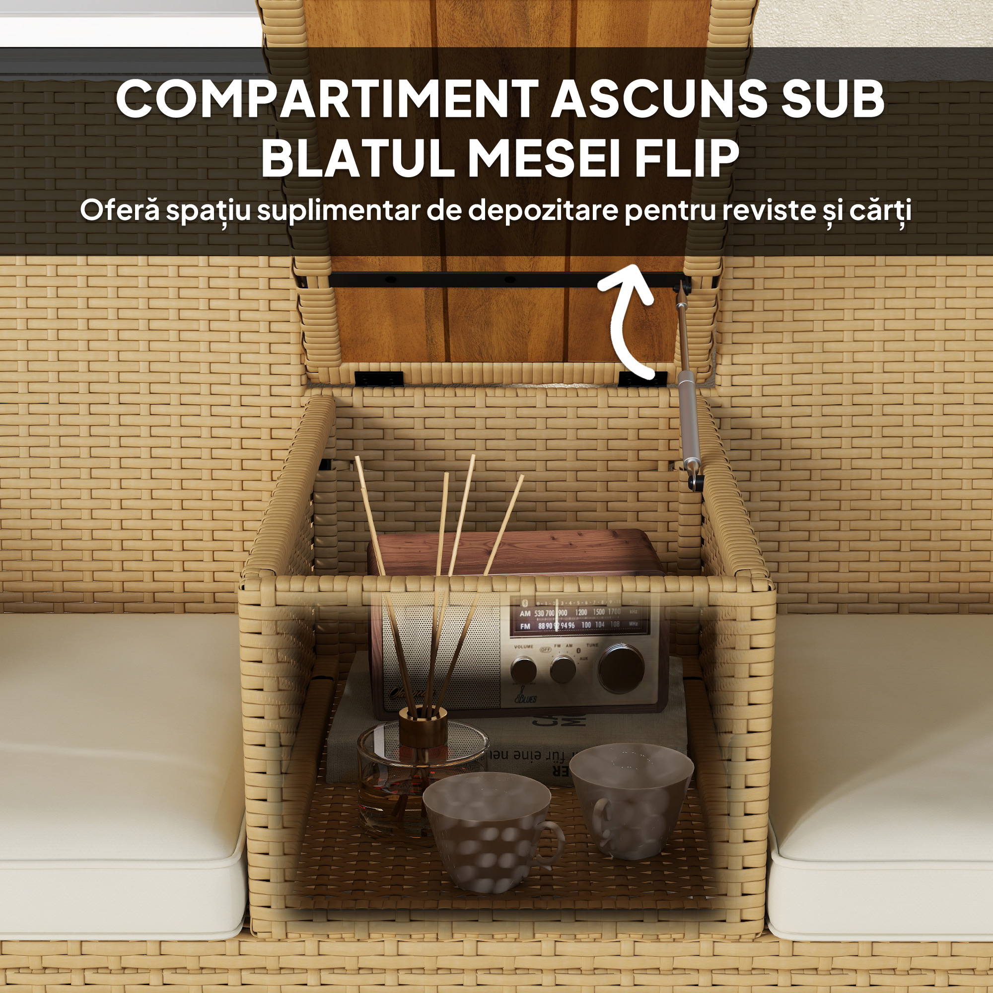 Canapea [BRAND NAME] din rattan, accesoriu ideal pentru exterior! Cu masa pliabila si compartiment secret, organizeaza spatiul discret. Constructie din rattan PE rezistent la UV cu perne confortabile, transforma balconul/terasa in oasis relaxant. Perfecta pentru cafeaua de dimineata sau admiratul apusului, combina functionalitate si estetica outdoor.