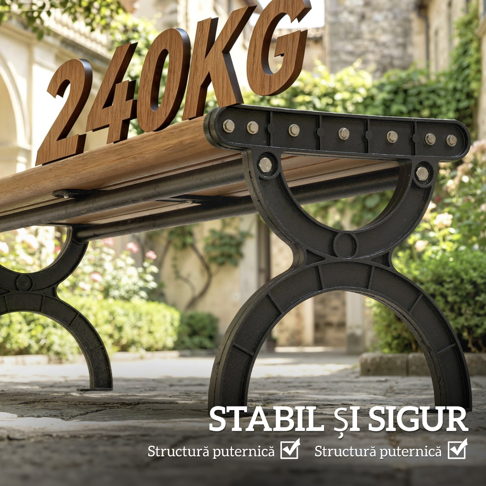 Plasarea unei banci in gradini deschise sau spatii publice poate parea o provocare. Banca [BRAND NAME] rezolva aceasta problema cu un cadru hibrid robust (240 kg), gauri pentru fixare in sol si finisaj cu efect de lemn natural, oferind stabilitate, fiabilitate si eleganta spatiului tau exterior.