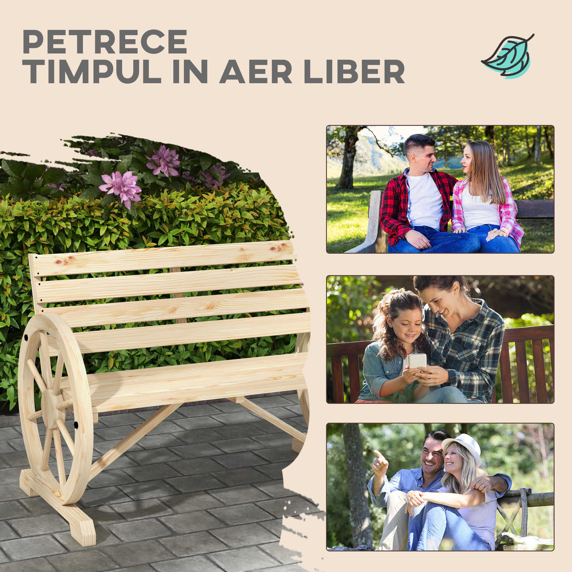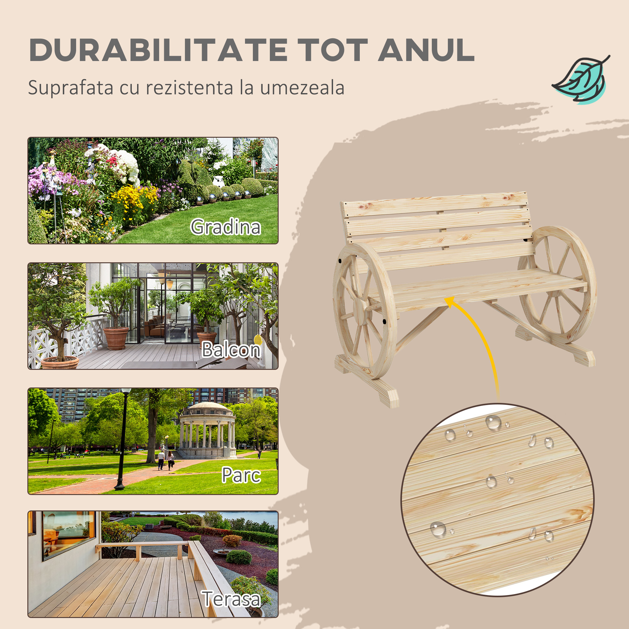Adauga un aer rustic decorului tau exterior cu aceasta banca originala de gradina [BRAND NAME]! Structura este realizata din lemn solid de brad, suficienta pentru 2 persoane, iar cotierele in forma de roata completeaza detaliile si stilul bancii. Creeaza o atmosfera autentica de tara in spatiile tale cu aceasta banca!