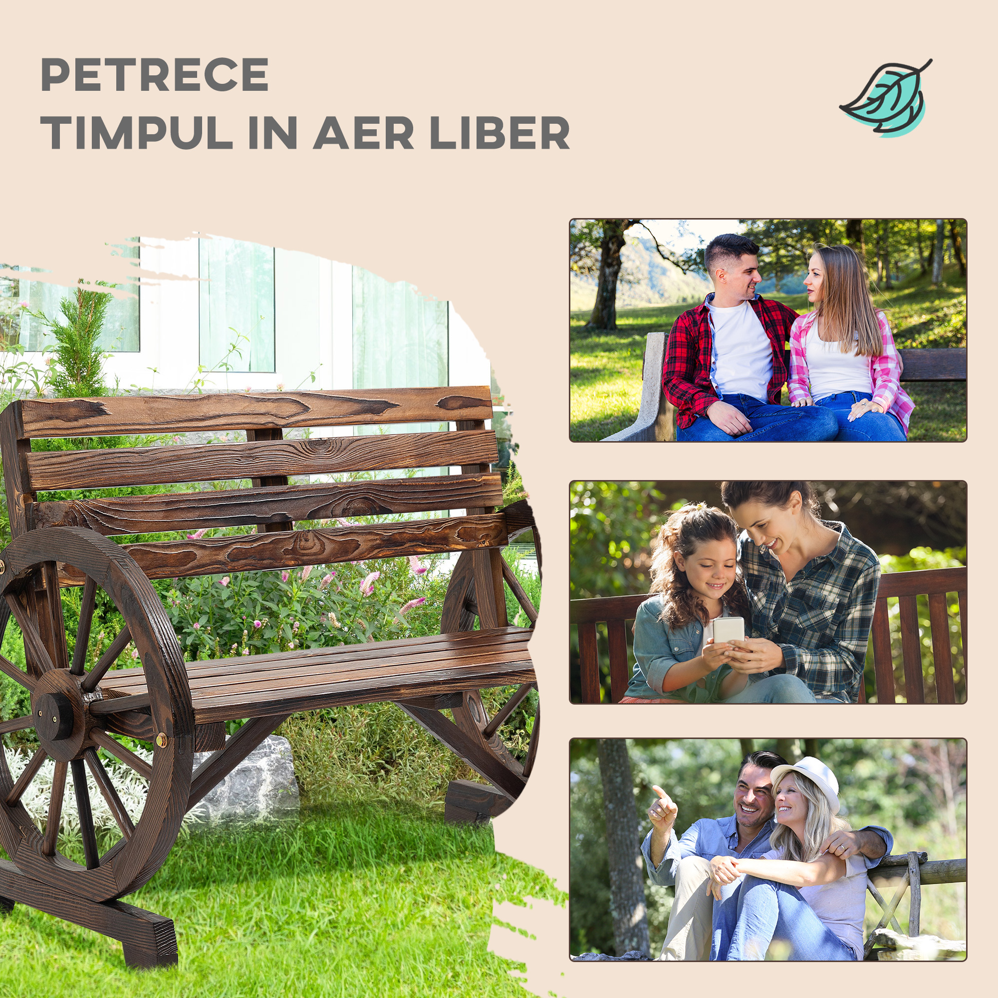 Adauga o nota rustica decorului tau exterior cu aceasta banca de gradina originala de la [BRAND NAME]! Structura este realizata din lemn solid de brad, suficient de mare pentru doua persoane, iar cotierele in forma de roata adauga detalii si stil unic bancii. Creeaza o atmosfera country autentica in spatiile tale cu banca noastra!