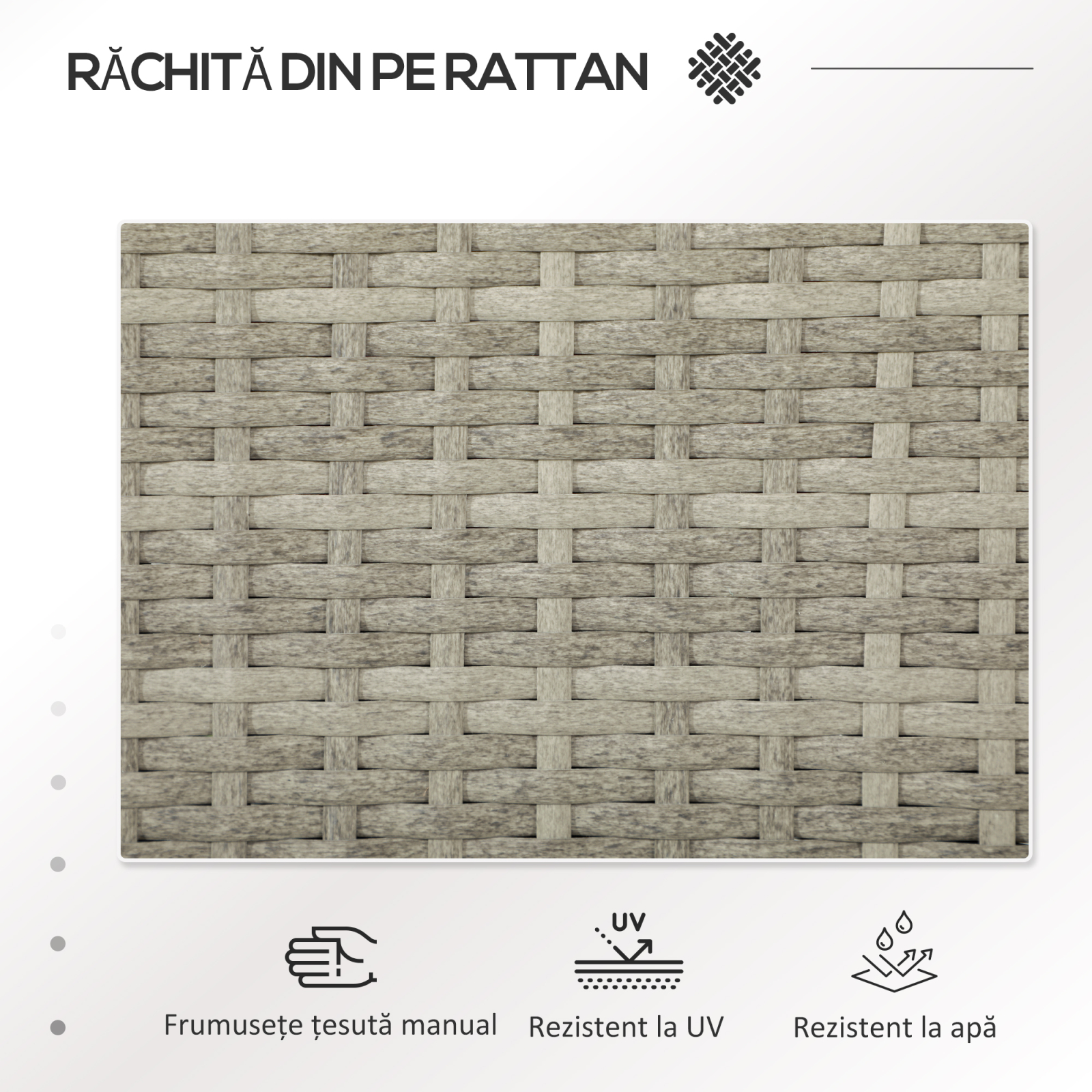 [BRAND NAME] iti ofera suportul perfect in sezonul cald cu banca noastra de gradina cu 2 locuri, separata de o masuta de cafea. Aceasta structura este ideala pentru conversatii in aer liber alaturi de prieteni, in timp ce savurati o gustare sau o bautura. Datorita cadrului din otel, impletiturii din ratan rezistenta la razele UV si husei lavabile, banca noastra de exterior este o alegere practica pentru relaxare de calitate in sezonul frumos.
