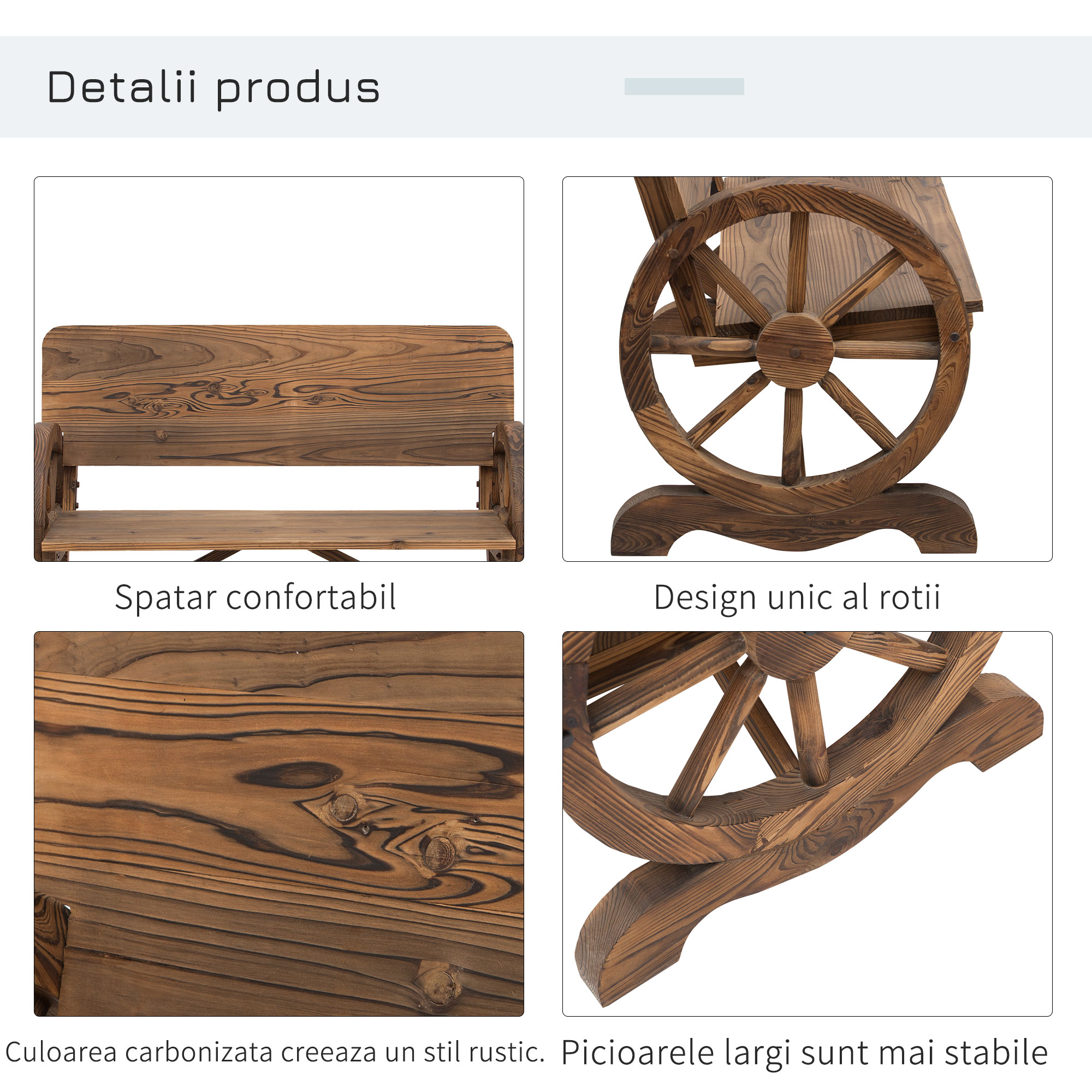 Aceasta banca confortabila din lemn solid de brad ofera spatar inalt pentru sustinere optima si doua roti laterale usor de manevrat. Finisajul maro natural protejeaza lemnul si adauga atmosfera rustica. Ideala pentru curti sau terase, combina eleganta cu functionalitatea. Designul robust asigura confort si durabilitate pentru familie si vizitatori.