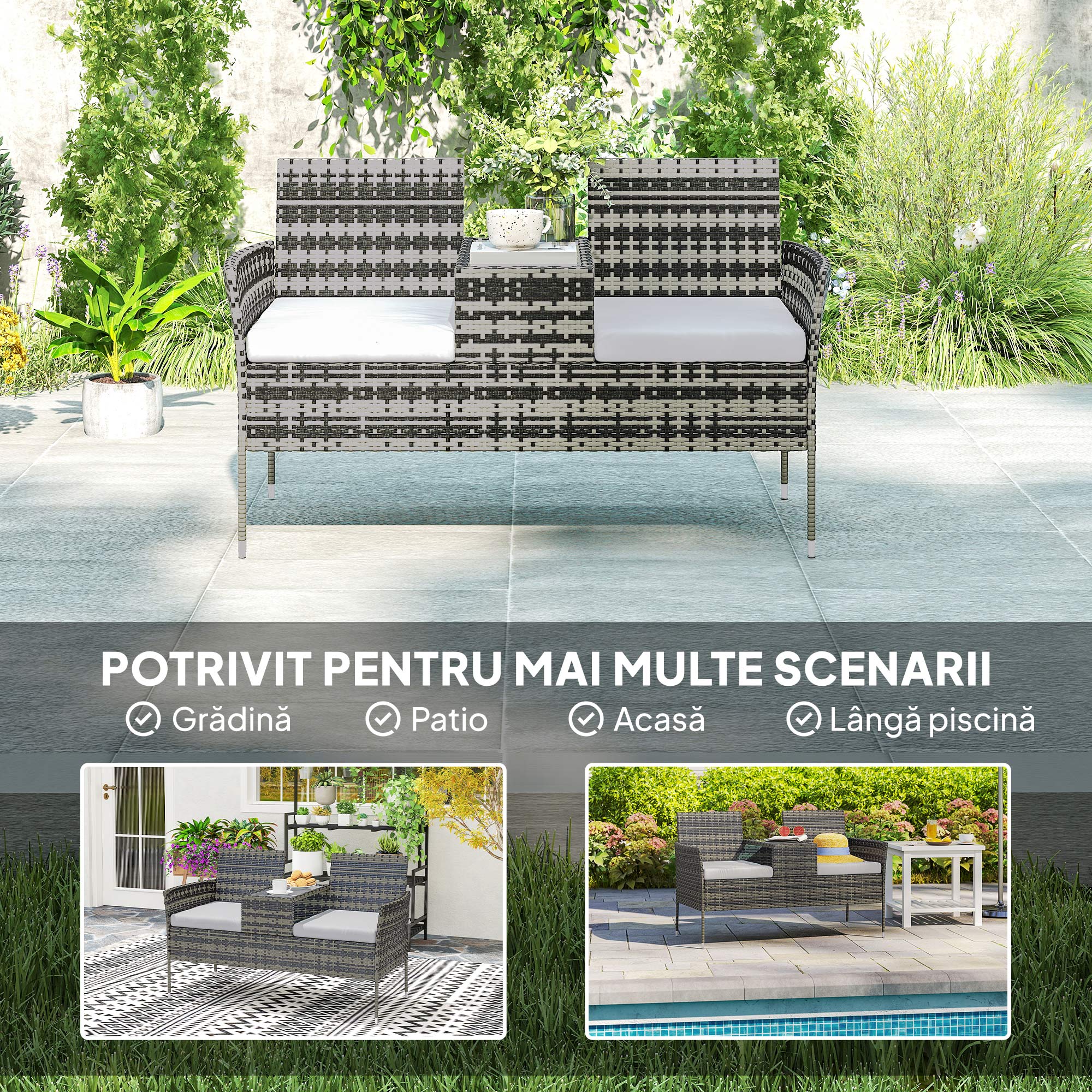 [BRAND NAME] iti ofera sprijinul necesar in sezonul cald cu banca noastra de gradina pentru 2 persoane, impartita de o masuta de cafea centrala. Aceasta structura este ideala pentru conversatii in aer liber alaturi de prieteni, in timp ce savurezi o gustare sau o bautura. Datorita cadrului din otel, materialului rattan rezistent la razele UV si huselor lavabile, banca noastra de exterior se dovedeste a fi o alegere practica pentru momente de relaxare de calitate in sezonul cald.