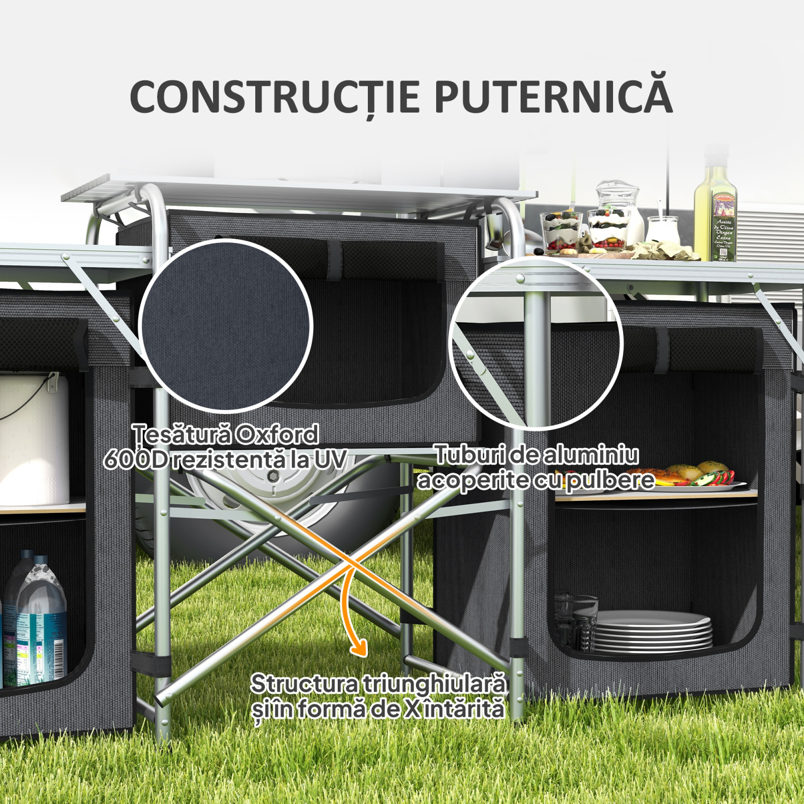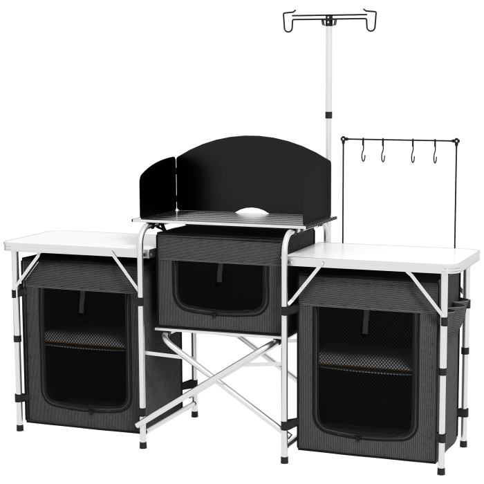 Datorita cantitatii mari de spatiu disponibil, bucataria noastra de camping [BRAND NAME] te poate sprijini eficient atunci cand ai nevoie sa pregatesti mancarea in timpul calatoriilor. Spatiul disponibil include 3 blaturi de lucru, un raft inferior, 3 dulapuri din material textil, 4 carlige si un suport pentru lumina reglabil pe inaltime. Unitatea de bucatarie pentru exterior te va ajuta sa mentii organizarea intr-un mod eficient.