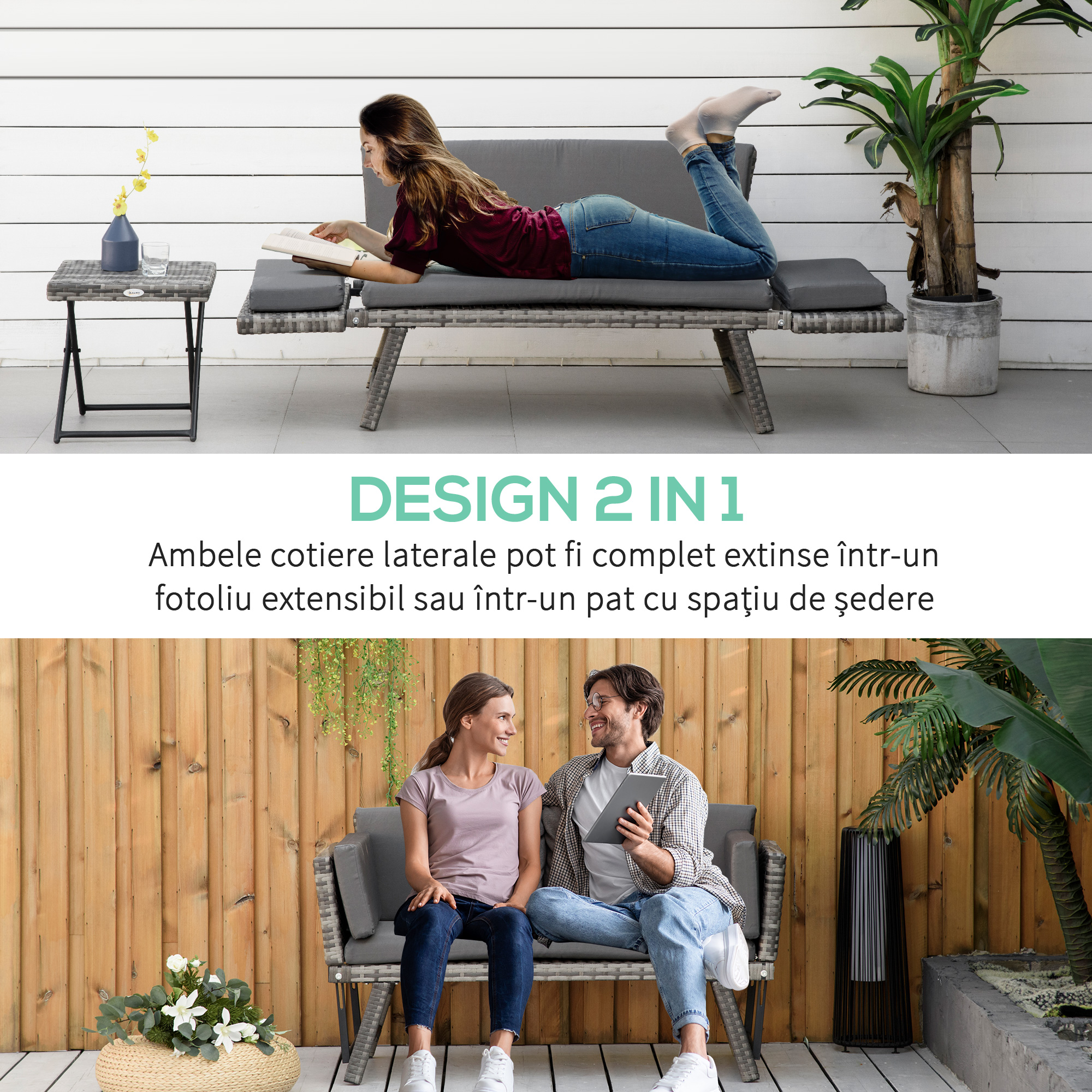 • EXTENSIBILA: Cotierele laterale ale canapelei de exterior pot fi extinse pentru a crea mai mult spatiu pentru sedere sau pentru a va culca