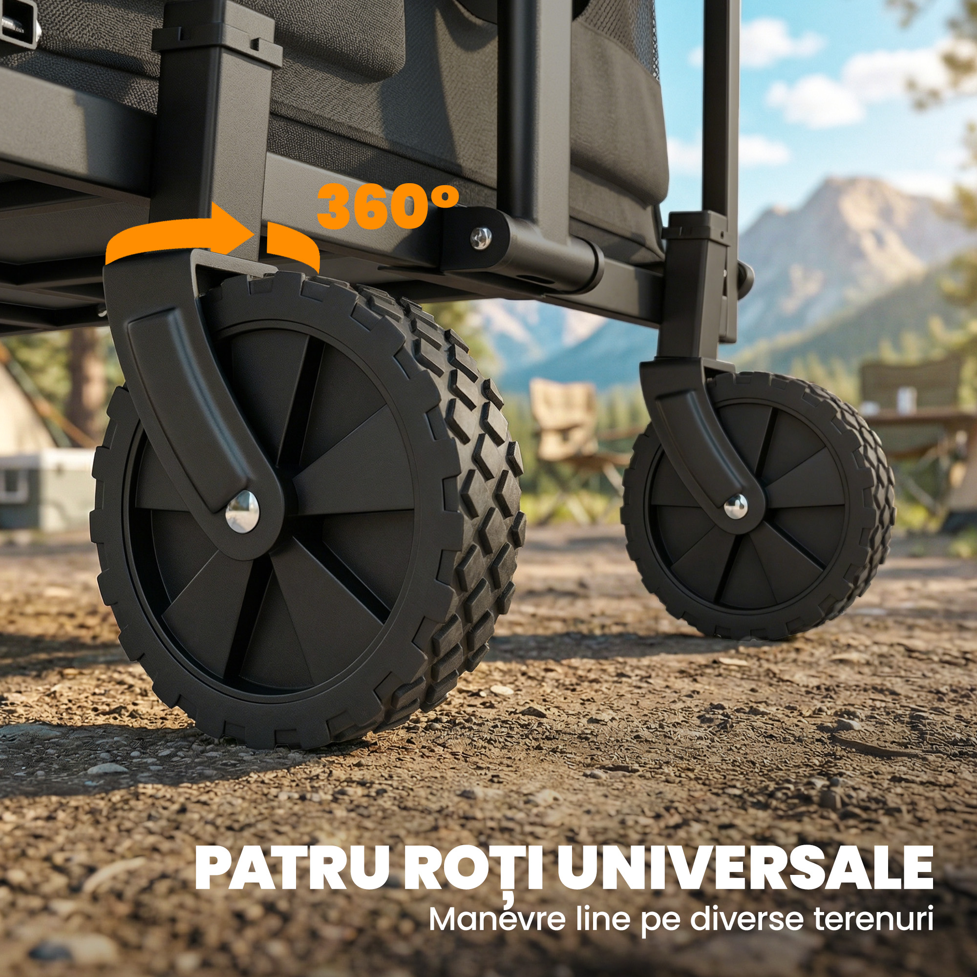 Drumurile repetate de la masina cu scaune voluminoase si echipamente grele pot transforma o excursie intr-o corvoada. Caruciorul de camping [BRAND NAME] simplifica totul: coada extensibila pentru obiecte lungi, maner reglabil pentru o tragere confortabila. Pliabil si compact, aduce comoditate aventurilor tale.
