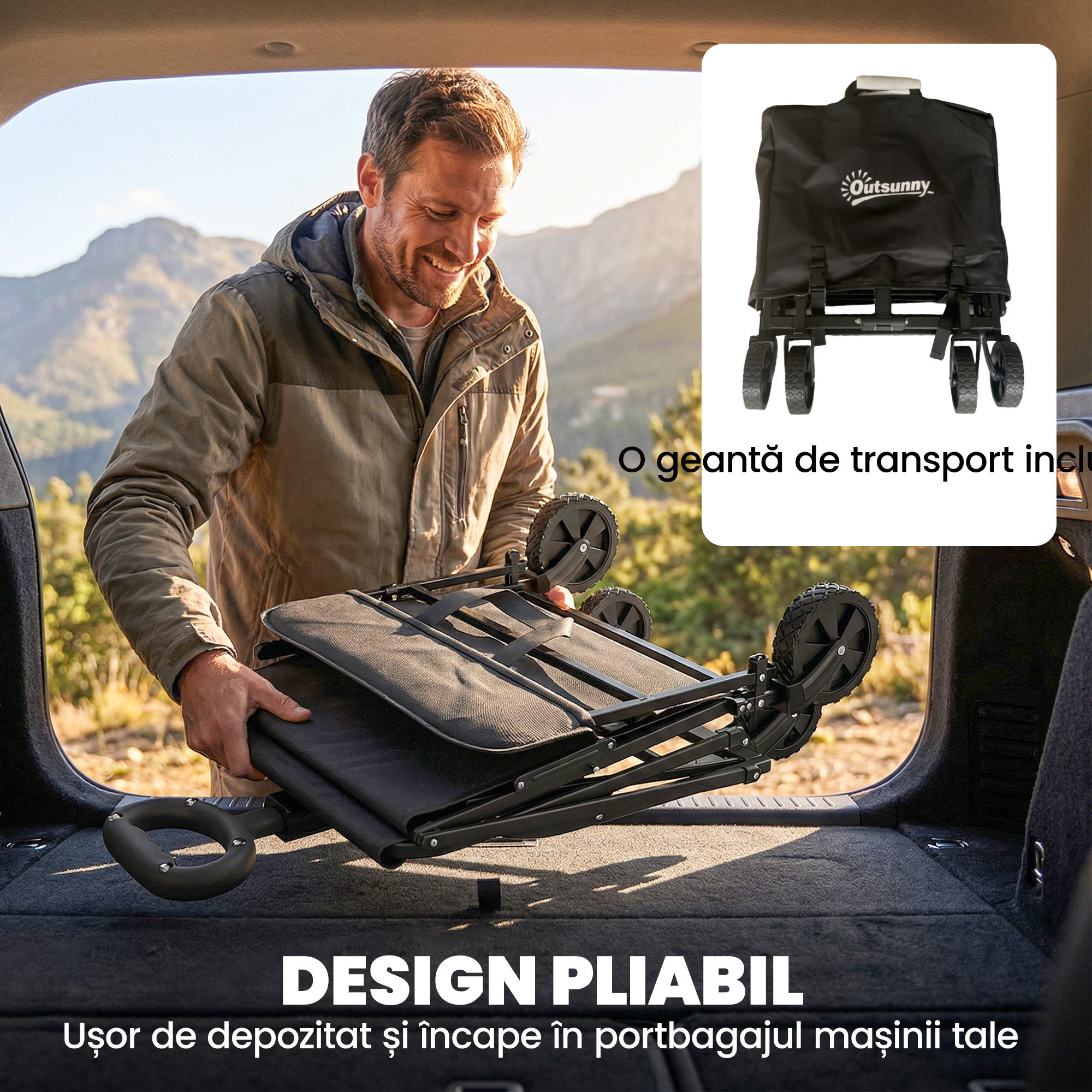 - UsOR DE PLIAT sI DEPOZITAT: Design compact pliabil al caruciorului de plaja (65x49x15 cm), potrivit pentru portbagaj sau acasa. Include geanta de transport, deja asamblat si gata de utilizare.