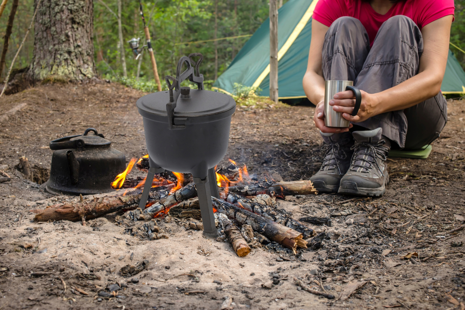 Continut pachet: ceaun, capac, 3 picioare, maner transport