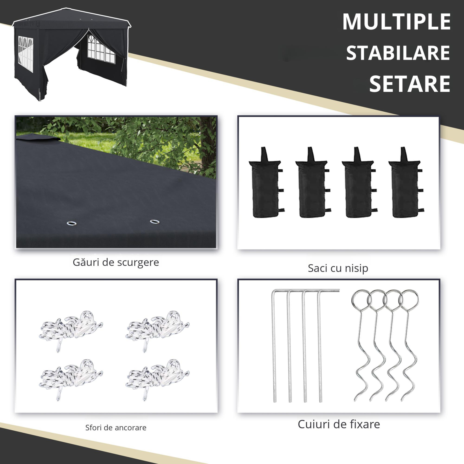 Pregatit pentru orice eveniment in aer liber? Acest cort pliabil [BRAND NAME] 3x3m este solutia ideala pentru picnicuri, targuri, petreceri in gradina sau camping. Designul sau inteligent include un acoperis rezistent la UV, inaltime ajustabila, copertina extensibila pentru protectie suplimentara si saci de nisip pentru stabilitate. Se pliaza rapid si vine cu geanta de transport - usor de manevrat, usor de iubit.