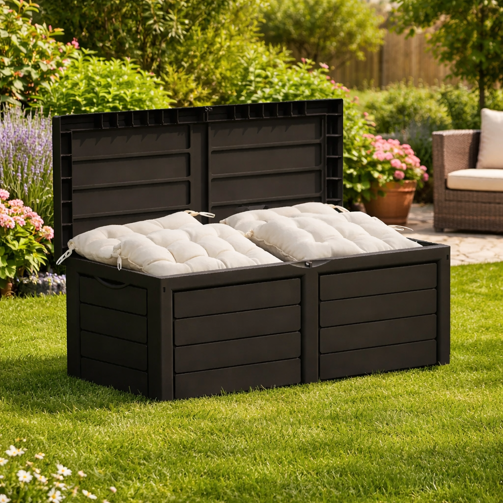 Cutia de depozitare pentru gradina, cu volum de 320 l, este o alegere practica pentru organizarea spatiului exterior. O poti folosi pentru perne, accesorii de gradina, unelte mici sau jucarii, pastrand totul la indemana si ferit de dezordine. Designul simplu si versatil se integreaza usor pe terasa, balcon sau in gradina.