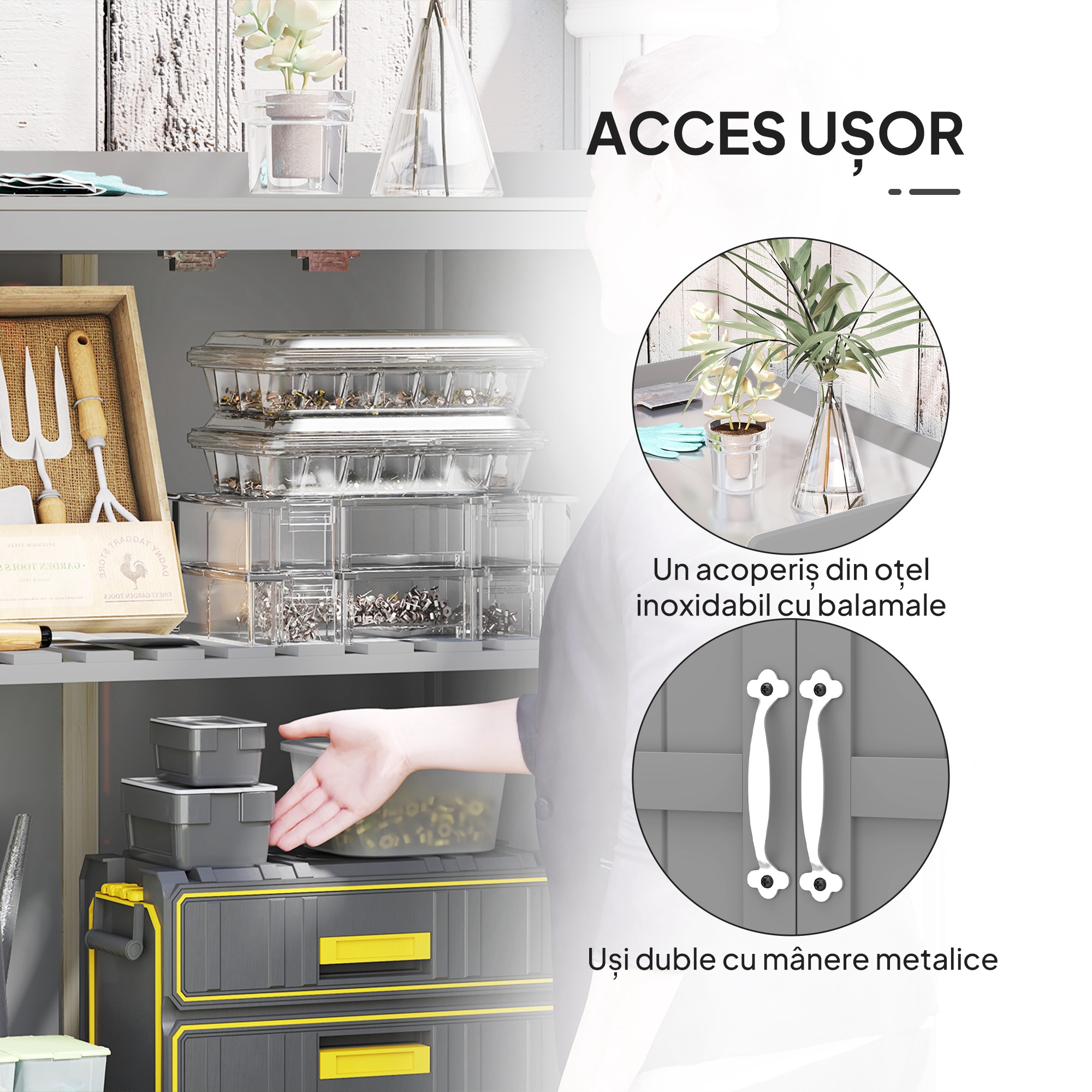 Transforma-ti gradina cu dulapul de exterior [BRAND NAME]! Pe langa faptul ca functioneaza ca o masa de lucru robusta, acest dulap din lemn dispune de un acoperis rabatabil si usi duble pentru acces practic. Raftul interior mentine uneltele organizate, iar designul cu lamele asigura ventilatie si rezistenta la umezeala. Blatul din otel inoxidabil garanteaza o durabilitate ridicata. Ideal pentru pasionatii de gradinarit care doresc un spatiu bine organizat!