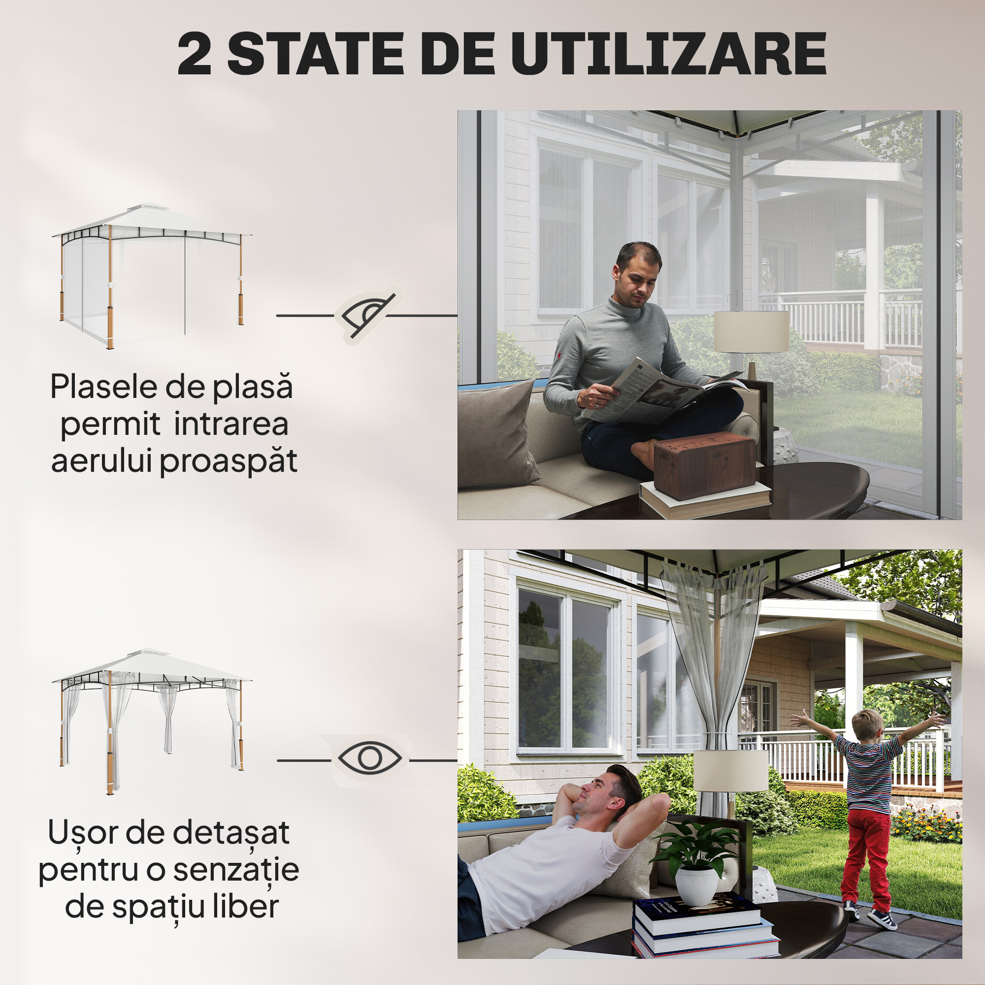 intalnirile tale merita mai mult confort decat spatiile exterioare imprevizibile. Foisorul de gradina [BRAND NAME], cu stalpi cu efect de lemn si acoperis dublu stratificat, ofera eleganta, ventilatie si confort pentru opt invitati. Acest foisor de exterior include o acoperire anti-UV si pereti din plasa, creand o oaza racoroasa si fara insecte pentru a va bucura impreuna de momente intr-un mediu rafinat.