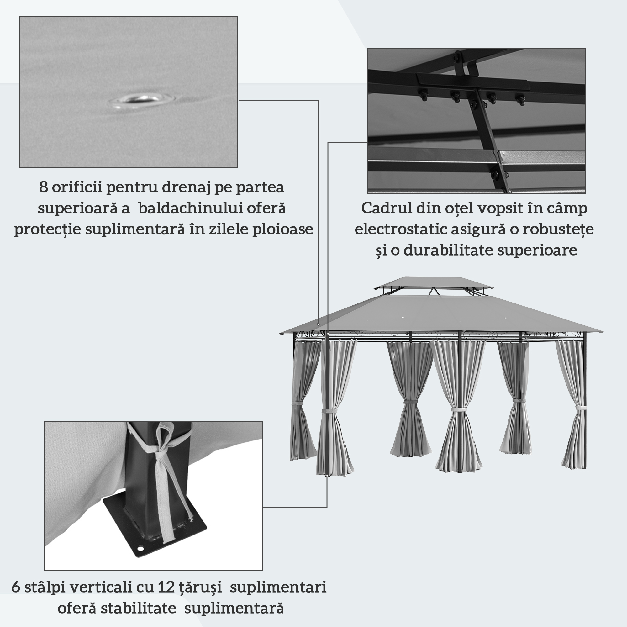 imbogateste-ti spatiul exterior cu acest elegant gazebo metalic [BRAND NAME] cu acoperis dublu. Structura ofera protectie UV de calitate si permite luminii solare sa patrunda, creand un mediu luminos fara a suferi de caldura verii. Datorita perdelelor detasabile, poti ajusta zona pentru a spori intimitatea si umbra disponibila, in timp ce acoperisul cu doua niveluri asigura o ventilatie optima.