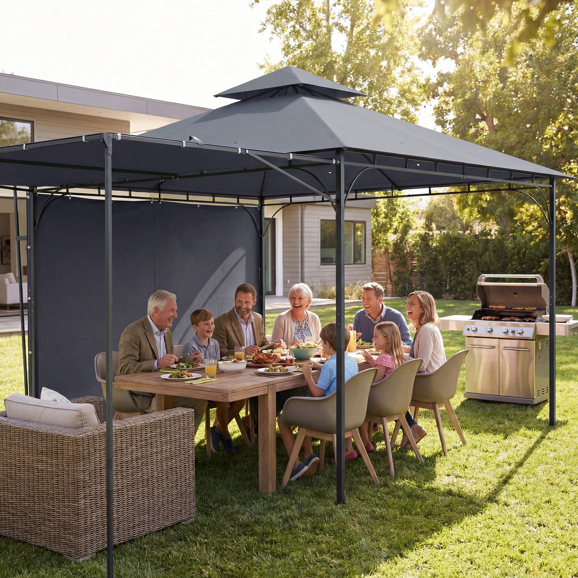 Vremea imprevizibila iti strica planurile? Foisorul [BRAND NAME], cu acoperis extensibil, protectie ventilata UPF 30+ si structura rezistenta la vant, ofera protectie solara, circulatie optima a aerului si siguranta. O solutie versatila pentru intalniri confortabile in orice ocazie.