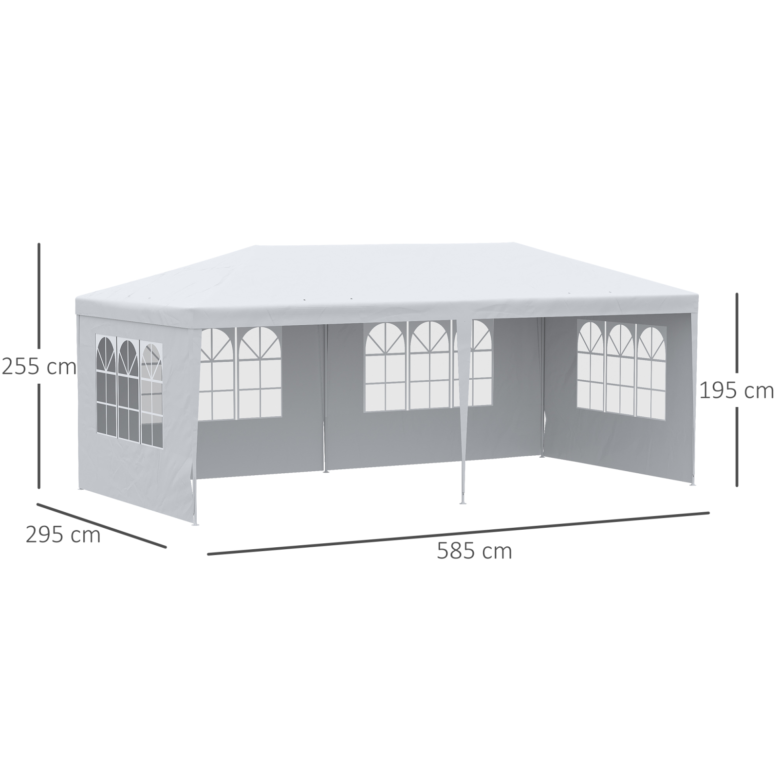 • DIMENSIUNI: Dimensiuni generale: 5.85 x 2.95 x 2.55 m. Dimensiuni ale peretilor laterali: 2.95 x 1.95 m. Dimensiuni ale ferestrei: 1.8 x 1.03 m. Nu lasati foisorul montat peste noapte sau in conditii meteorologice nefavorabile