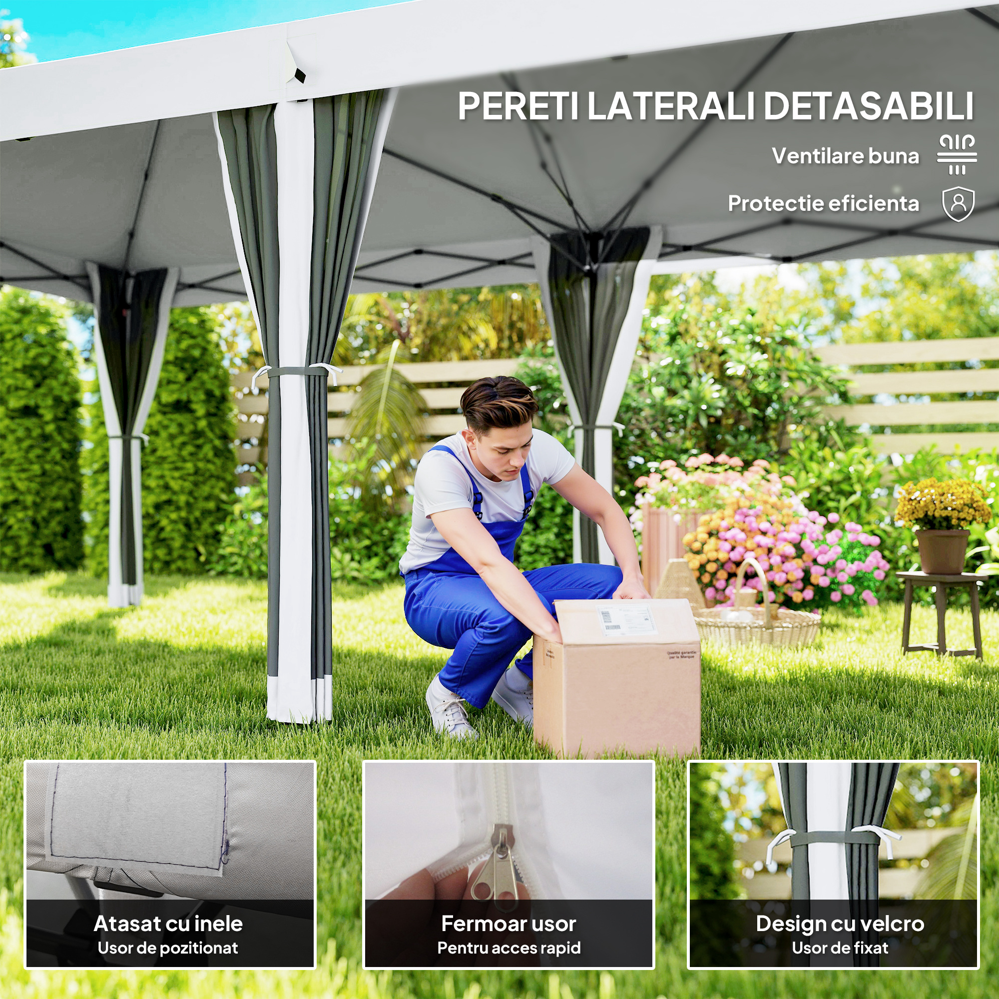 Vrei sa primesti multi oameni in aer liber? [BRAND NAME] iti ofera solutia perfecta cu pavilionul pop-up de 3 x 6 metri, dotat cu pereti laterali pentru a oferi umbra fara a se decolora. Acest pavilion de exterior este rapid de montat, mutat si depozitat, fiind potrivit pentru orice ocazie in aer liber. Fie ca ai nevoie sa acoperi un stand, sa organizezi o petrecere in aer liber sau sa protejezi gradina de soare, acest pavilion pliabil iti va satisface toate nevoile!