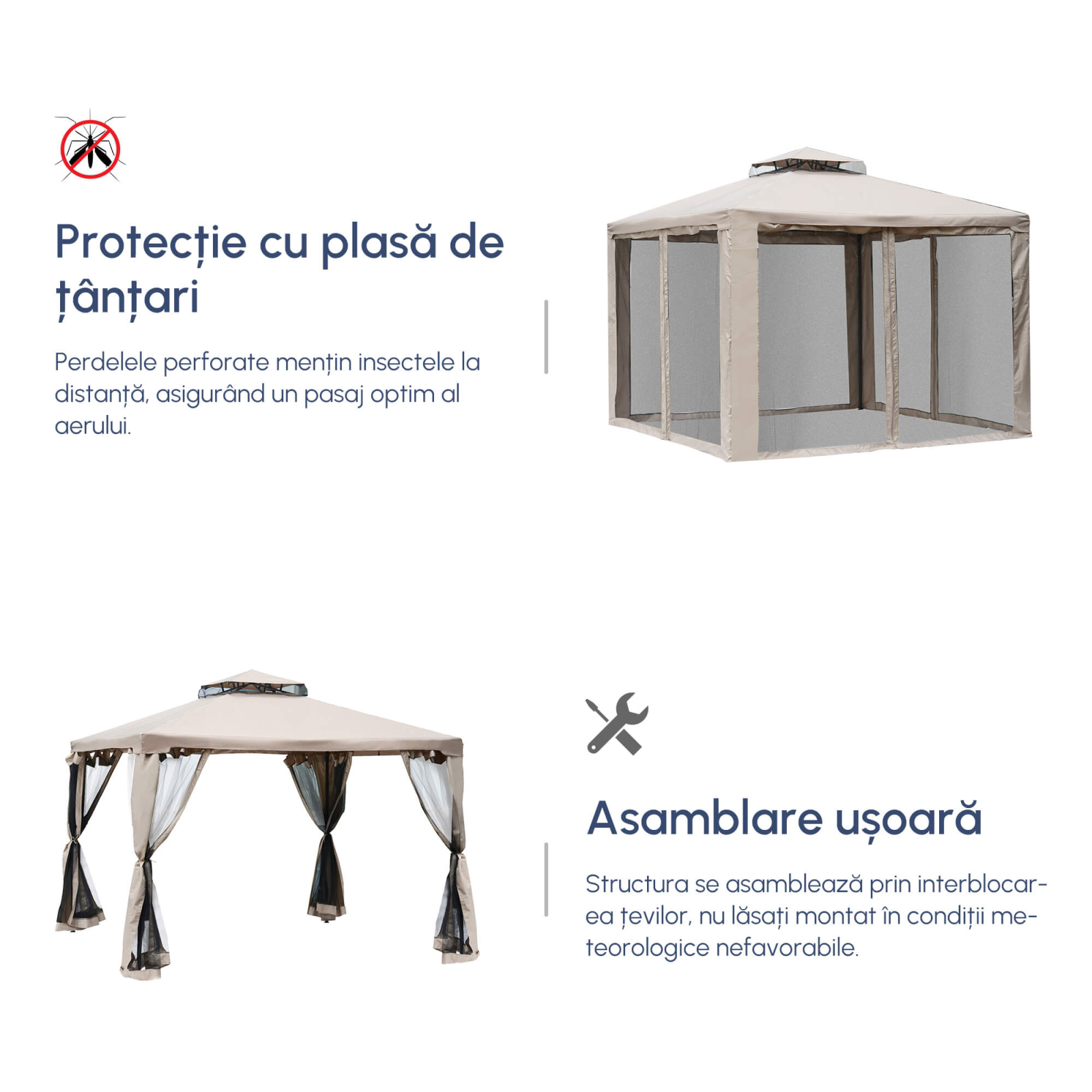 Transformati-va gradina intr-un paradis de relaxare cu pavilionul de gradina [BRAND NAME], perfect pentru cei care se bucura de pensie. Proiectat elegant si practic, acest foisor va ofera un spatiu confortabil pentru a va bucura de natura. Cadrul metalic robust si acoperisul din poliester il protejeaza de soare si ploaie, iar plasele de tantari de pe toti cei patru pereti va permit sa va bucurati de aerul proaspat fara a fi deranjati de insecte. Aceasta este o oaza linistita si frumoasa in gradina dvs.