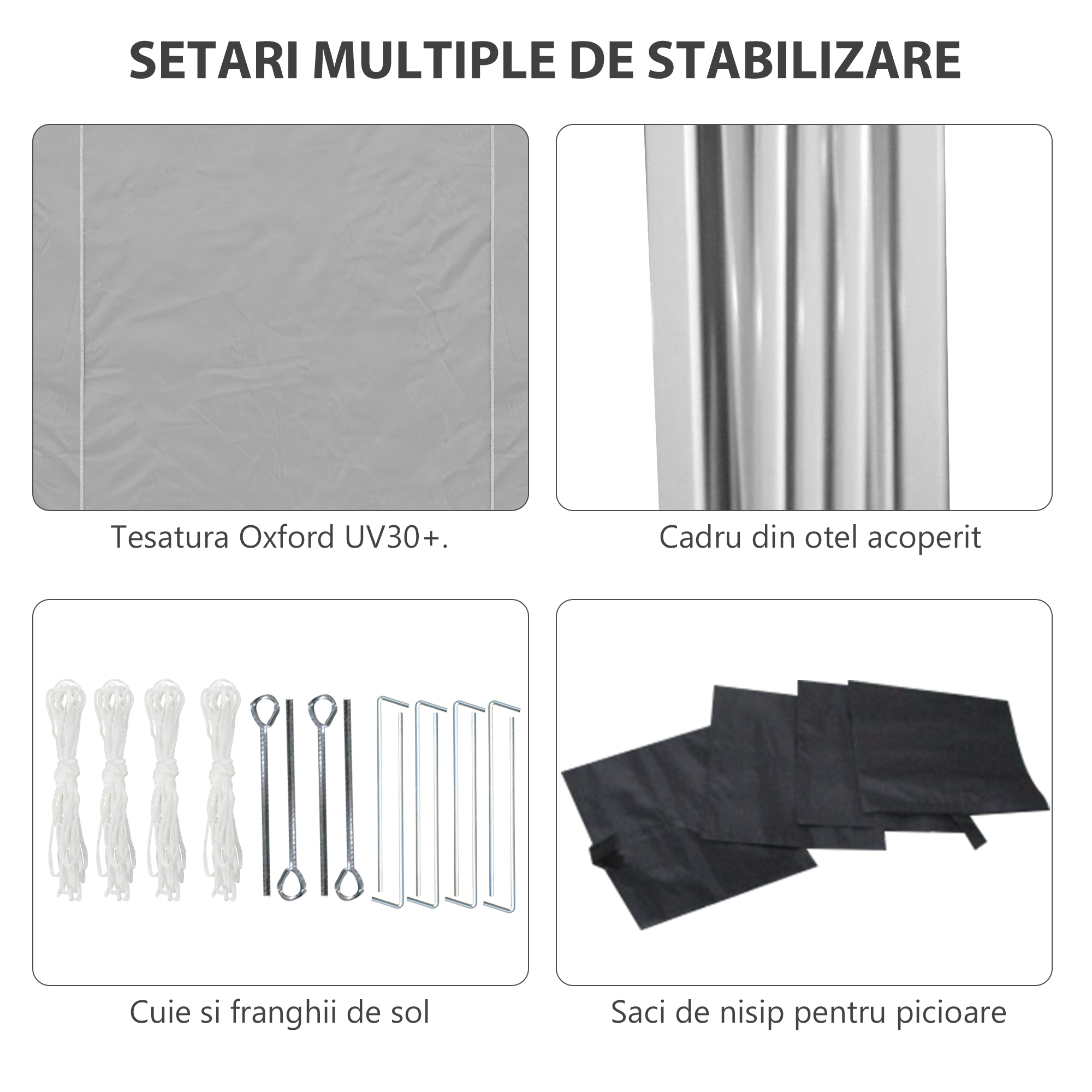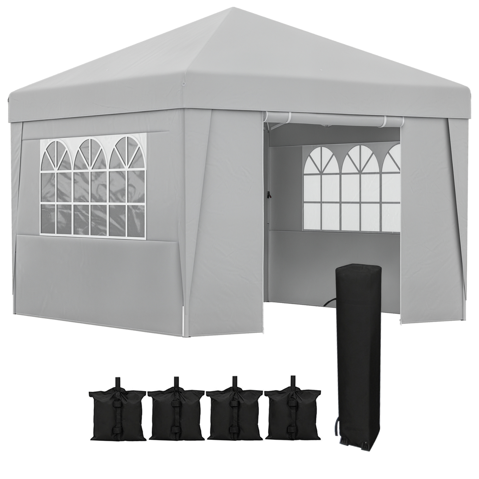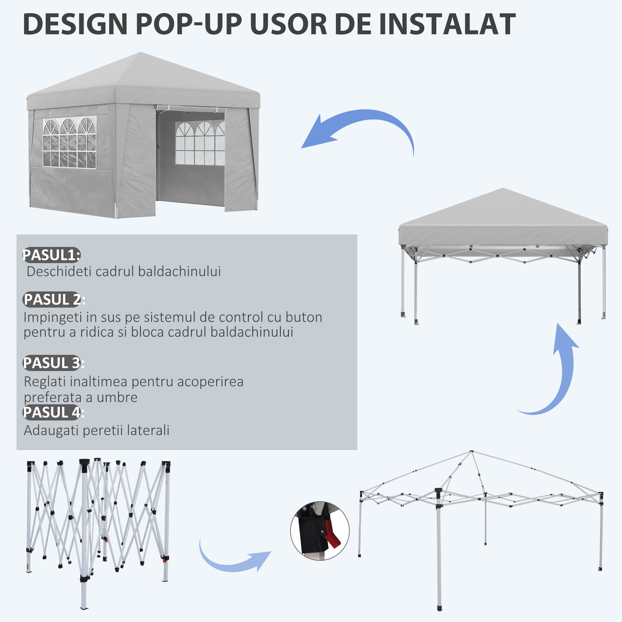 Fie ca este un eveniment formal, un moment de relaxare sau o petrecere intre prieteni, acest foisor pliabil [BRAND NAME] iti ofera un spatiu perfect pentru momentele tale in aer liber. Designul pop-up iti permite sa il asamblezi si sa il demontezi rapid, in timp ce geanta de transport inclusa iti permite sa il iei oriunde ai nevoie. Regleaza structura in inaltime pe 3 niveluri, in timp ce ferestrele decorate din plastic asigura o trecere optima a luminii. Pregateste-te sa organizezi petrecerile tale in aer liber!