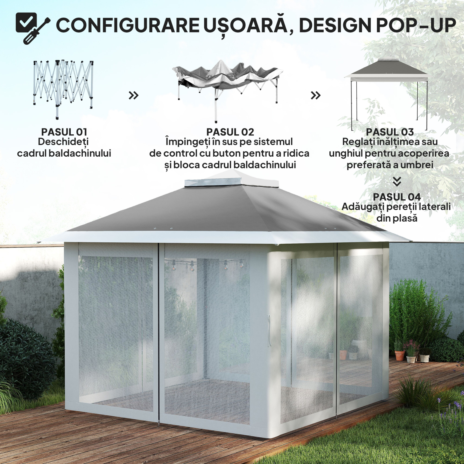 Fa-ti gradina mai functionala si practica cu acest foisor de exterior [BRAND NAME]. Cadrul din metal vopsit cu pulbere este reglabil pe inaltime la 3 niveluri diferite, in timp ce peretii laterali cu plasa de tantari ofera o zona de relaxare protejata de soare si insecte. Bucura-te de momentele in aer liber cu aceasta structura fiabila si completeaza-ti mobilierul de exterior!