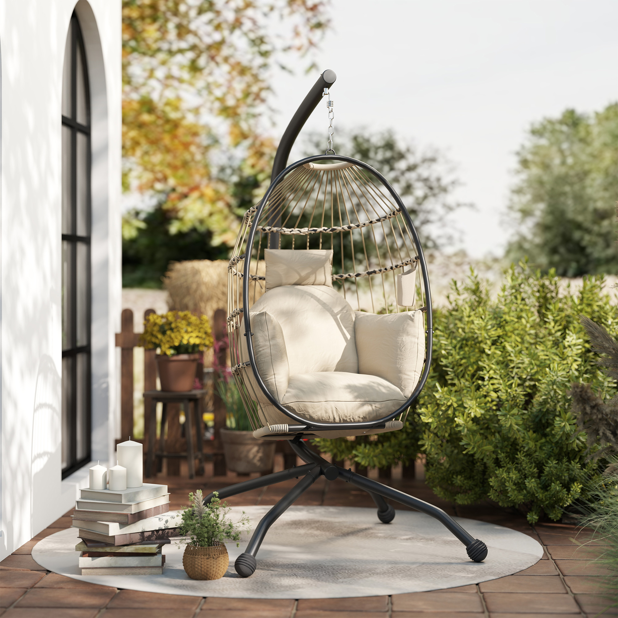 Bucura-te de confortul suprem in aer liber cu fotoliul suspendat tip ou [BRAND NAME]! Structura din otel cu baza in forma de X are un design elegant in forma de cuib, impletit si perforat, un cos pliabil pentru depozitare usoara si un suport integrat pentru pahare. Perna groasa de 20 cm, bratele si perna separata pentru cap ofera un nivel superior de relaxare, iar lantul reglabil permite ajustarea balansului conform nevoilor tale.