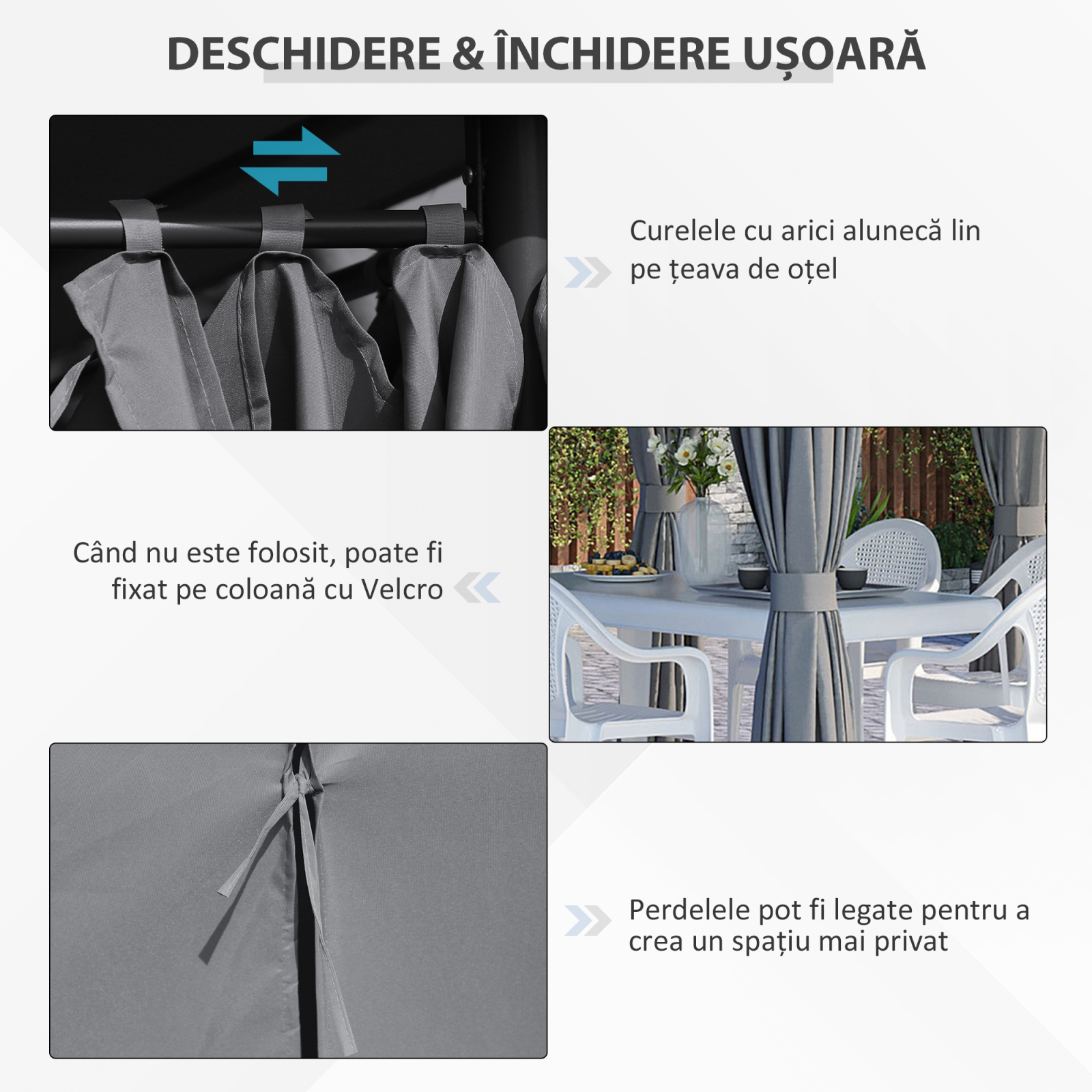 imbogateste spatiul tau exterior cu acest gazebo elegant din metal de la [BRAND NAME]. Structura ofera protectie UV de calitate si permite trecerea luminii solare pentru a crea un mediu luminos fara a suferi de caldura verii. Datorita perdelelor detasabile, poti ajusta zona pentru a spori intimitatea si umbra, perfect pentru relaxare, fie in solitudine, fie alaturi de prieteni.