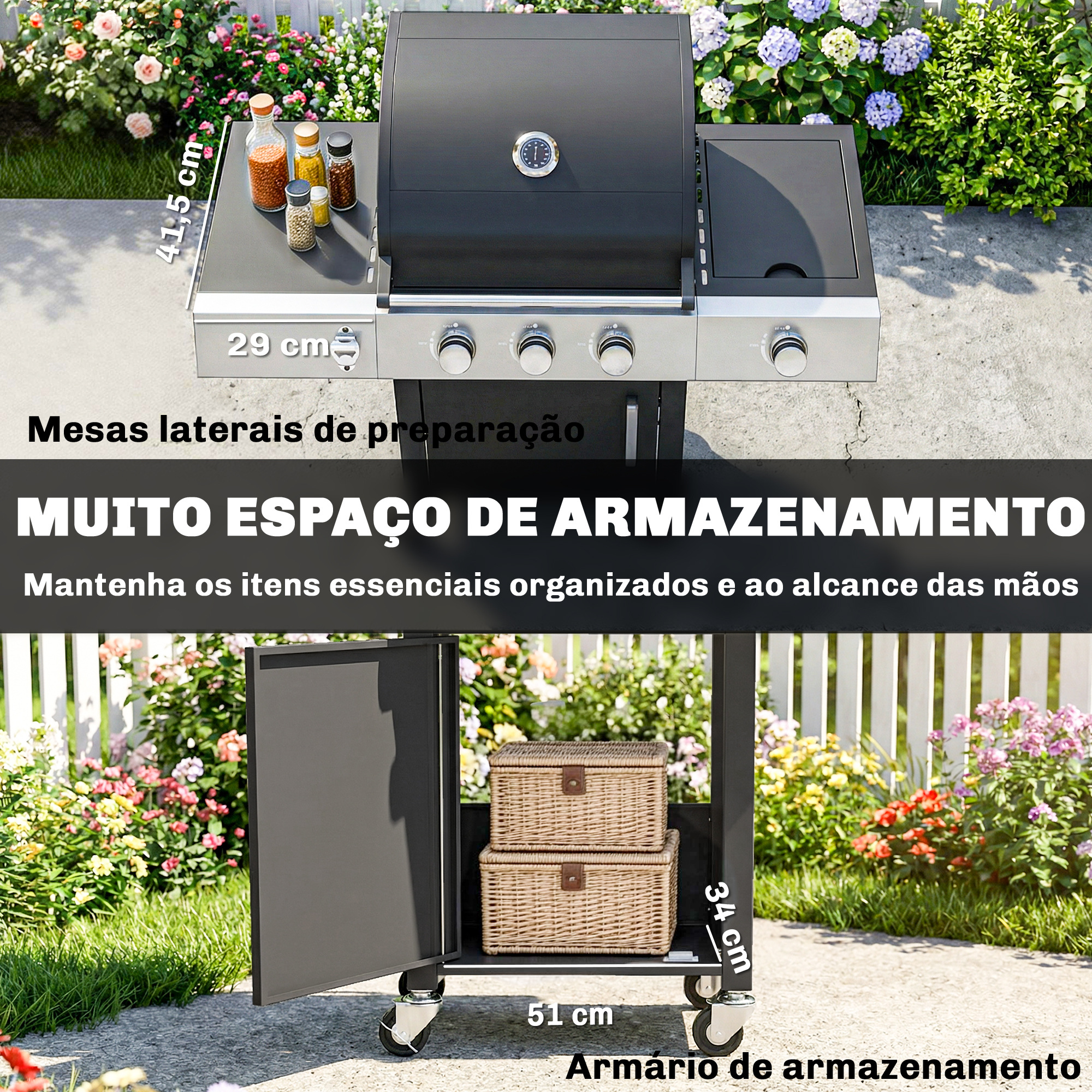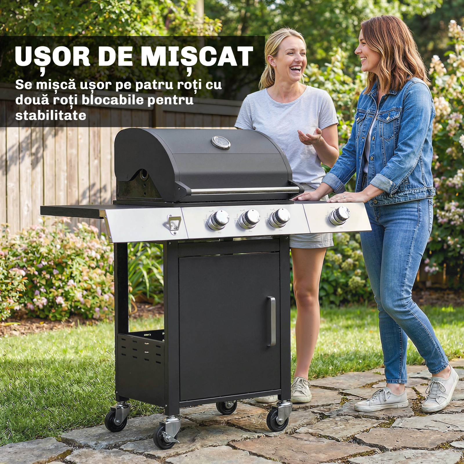 Gratarele pe gaz propan adesea necesita gestionarea gatitului pentru invitati in timp ce mancarea se raceste. Dezordinea cu ustensilele si sosurile imprastiate adauga stres. Gratarul pe gaz [BRAND NAME] iti readuce placerea de a gazdui. Cele trei arzatoare principale si un arzator lateral iti permit sa gatesti totul simultan, iar gratarul de incalzire mentine mancarea pregatita. Cele doua mese laterale si dulapul de depozitare ajuta la organizarea spatiului pentru o experienta relaxanta.