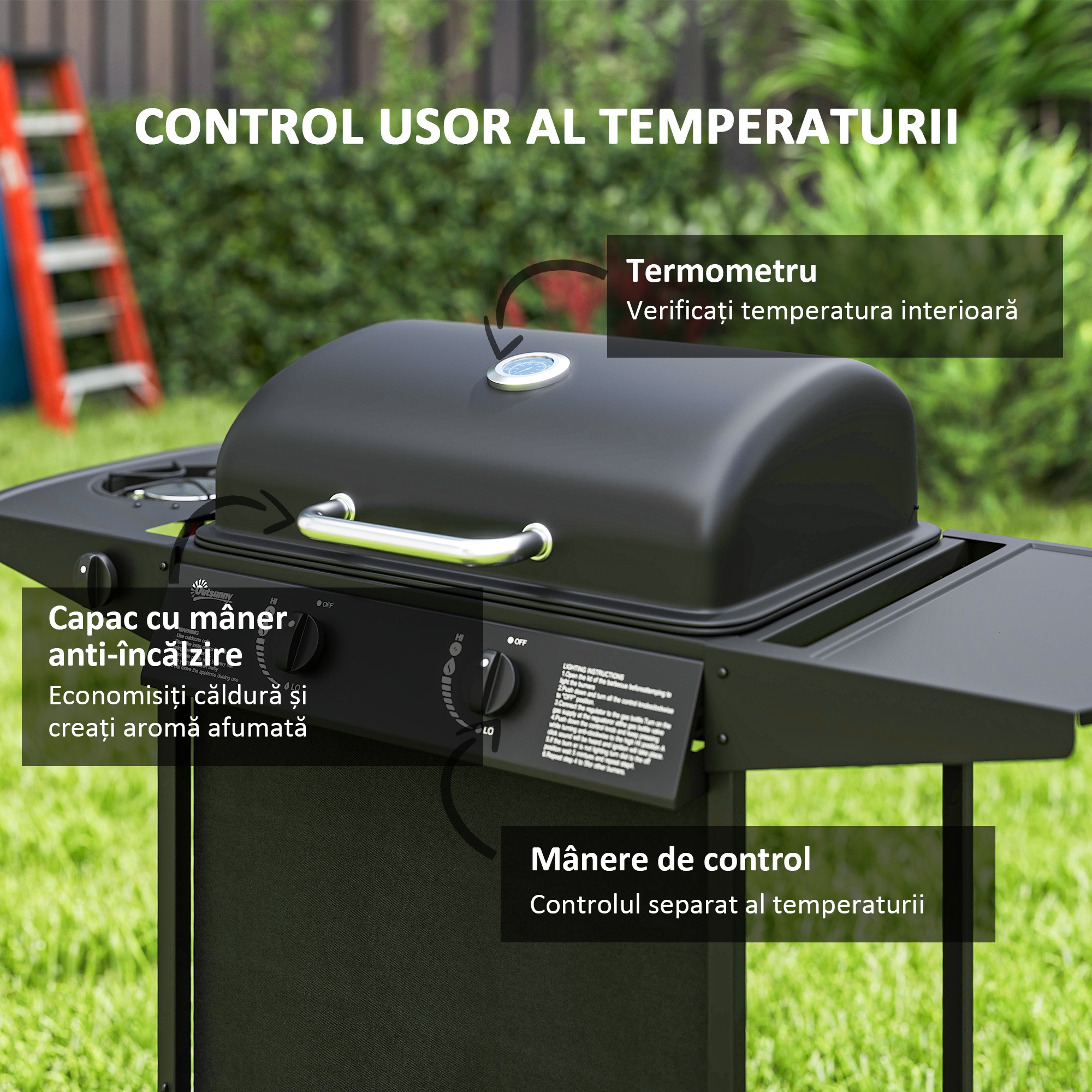 Aprinde gratarul de gradina [BRAND NAME] cu 3 arzatoare! Cu o suprafata ampla de gatit de 1776 cm² si un suport de incalzire, acest gratar pe gaz ofera spatiu suficient pentru a pregati un festin de savurat in companie. Arzatorul lateral mentine calde sosurile si garniturile in timp ce gatesti felul principal. Datorita arzatoarelor reglabile individual si termometrului incorporat cu scala dubla, obtinerea temperaturii ideale pentru gratar este extrem de simpla!