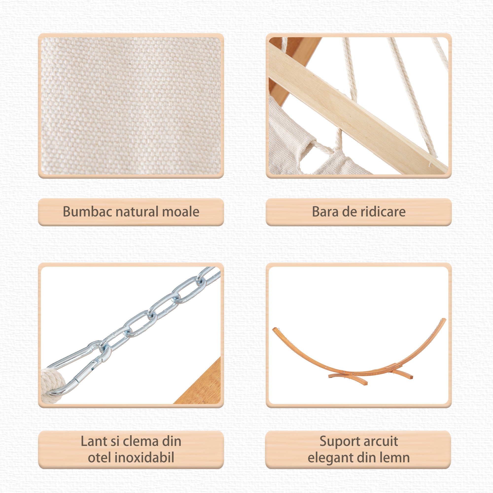 Acest hamac de exterior cu cadru din lemn [BRAND NAME] este un element excelent pentru relaxare la soare si pentru a te bucura de aer liber. Vine furnizat cu un cadru din lemn curbat cu bare si inele pentru a atarna sezlongul pe un suport robust. Realizat din lemn de Yang pentru structura si o tesatura de bumbac 100% dublu stratificat, hamacul de gradina are o capacitate de 150kg. Acesta este un plus grozav pentru gradina ta, capabil sa se potriveasca cu orice decor exterior.