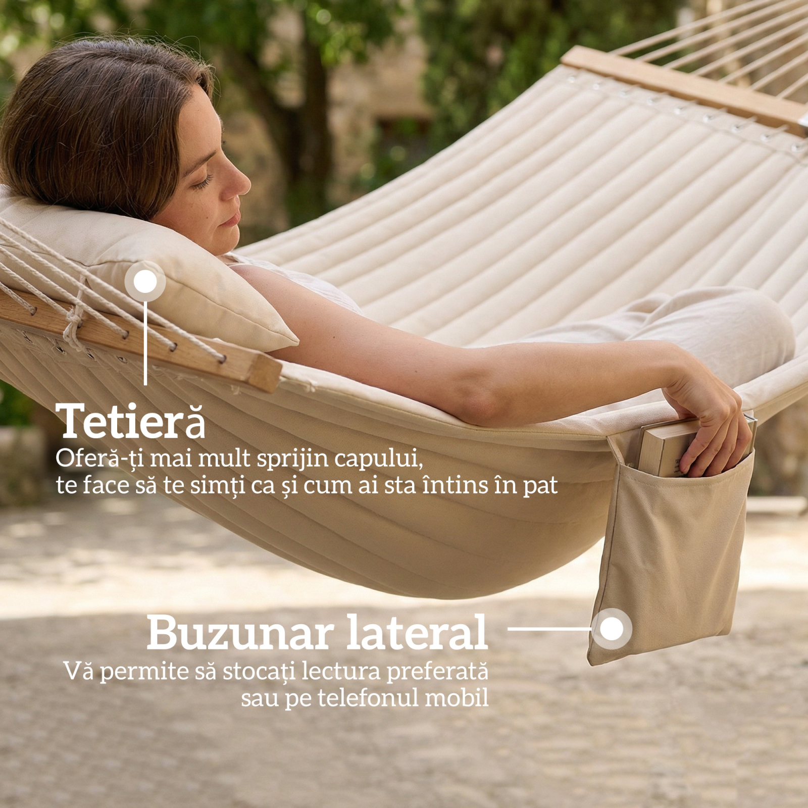 Relaxarea pe un hamac poate fi incomoda din cauza tesaturii, spatiului sau oscilatiilor instabile. Hamacul [BRAND NAME] ofera confort datorita umpluturii matlasate, unui pat spatios de 200 x 140 cm pentru doua persoane si barelor din lemn anti-rasturnare. Perfect pentru balcon sau terasa, asigura relaxare in doi fara griji.