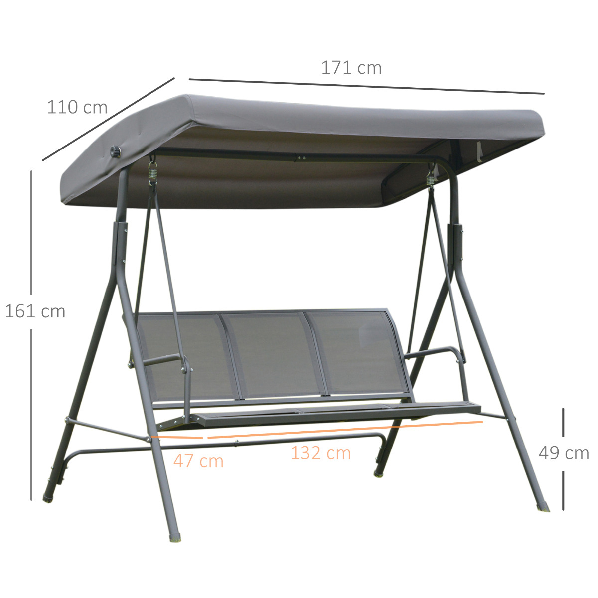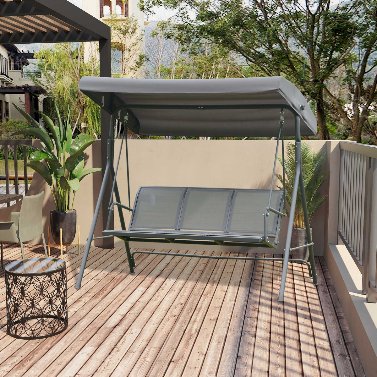 Bucurati-va de timp liber pe terasa sau gradina. [BRAND NAME] leagan 3 locuri, cu acoperis, 178x111x155 cm gri va fi locul perfect unde sa va relaxati. Suficient de incapator si rezistent, acesta va trona an de an in acelasi loc. Rezista foarte bine la rugina si uzura. [BRAND NAME] leagan 3 locuri, cu acoperis, 178x111x155 cm gri are marele avantaj de a fi realizat din structura metalica rezistenta, cu acoperire, tesatura din poliester. Puteti regla, pentru a crea umbra in orice moment al zilei.
