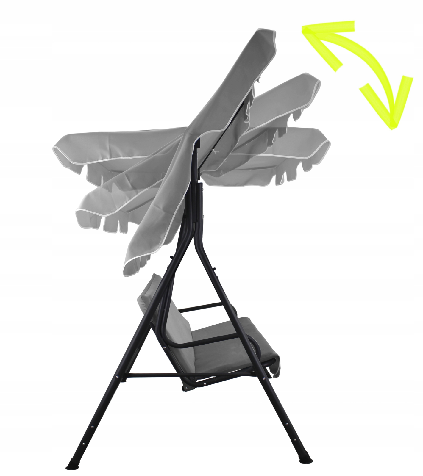 Acoperisul poate fi reglat cu mai mult de 45 de grade pentru o pozitionare optima. Este suficient sa slabiti butonul si sa inclinati viziera la unghiul dorit prin strangerea butonului. Acoperisul este realizat in mare parte din materiale tesute, ceea ce il face usor si usor de instalat si utilizat. Toate capetele elementelor metalice sunt echipate cu dopuri din plastic. Acest lucru previne ranile, astfel incat leaganul este sigur pentru copii si batrani.