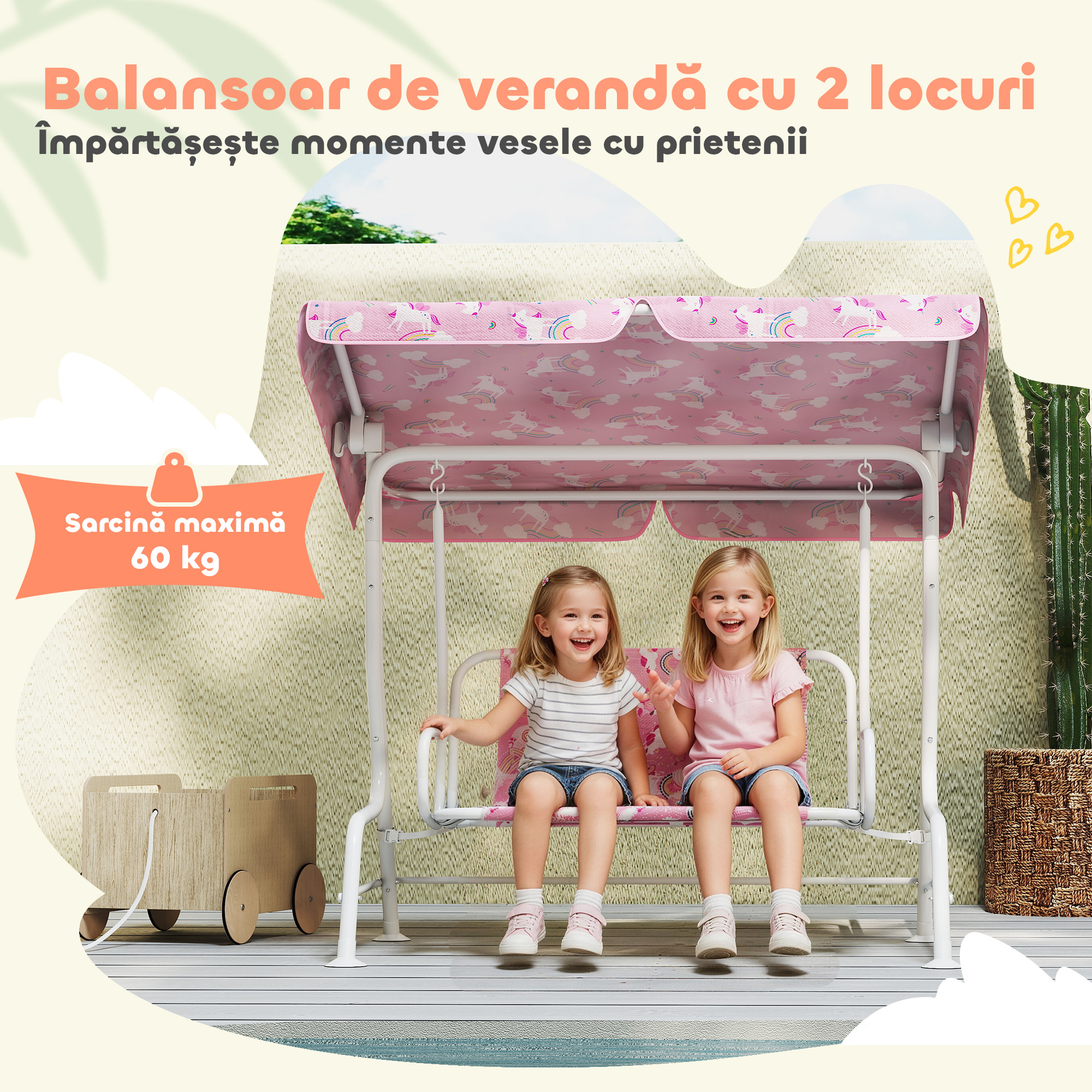 Acest leagan pentru copii cu acoperis [BRAND NAME], cu cadru din otel intarit, garanteaza stabilitate si siguranta fara rasturnari. Designul cu unicorni si curcubee stimuleaza imaginatia, in timp ce centurile duble si picioarele antiderapante protejeaza copiii. Scaunul dublu ofera momente de bucurie impartasite, oferindu-ti ocazia sa te relaxezi si sa urmaresti aventurile lor de poveste cu liniste.