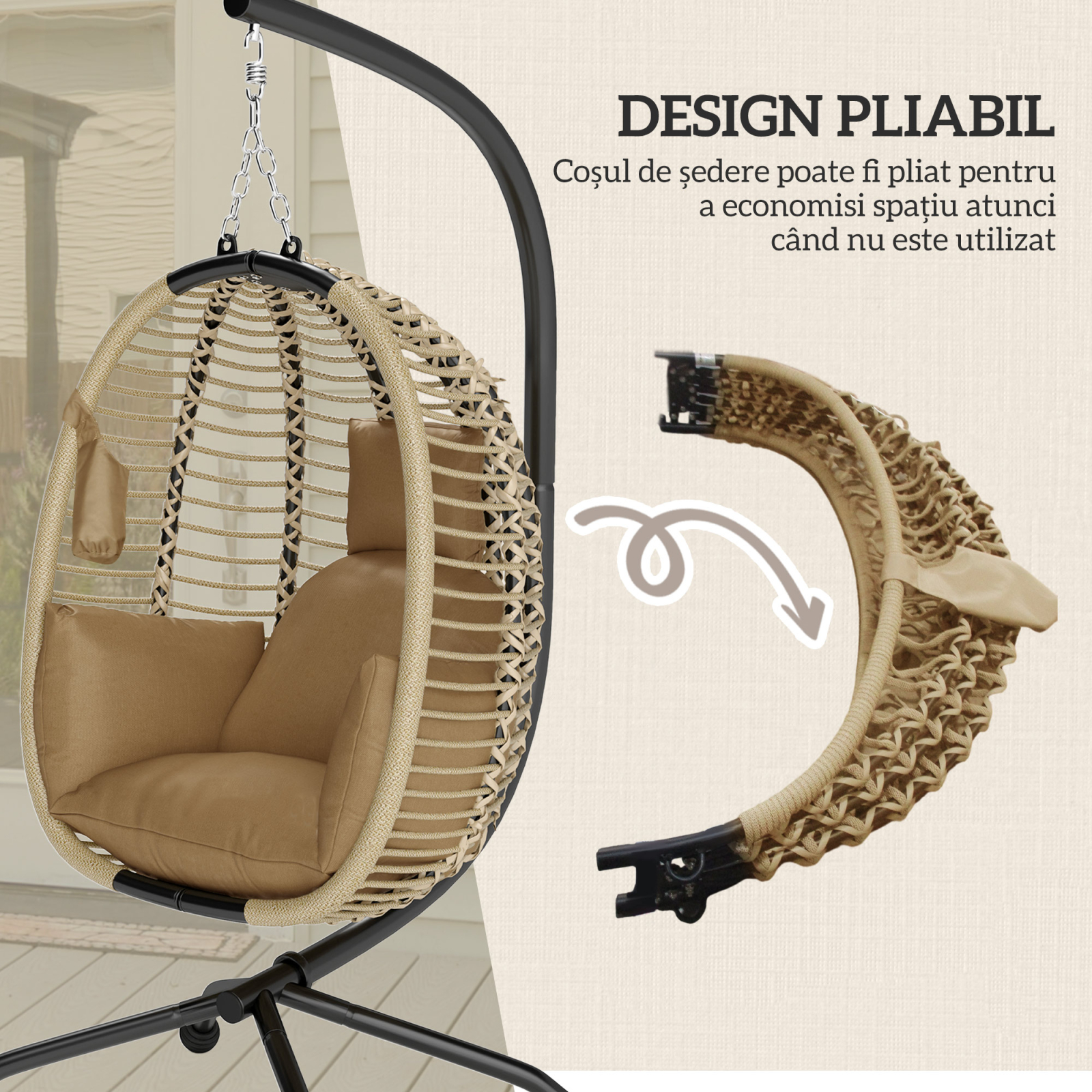 Pentru momentele tale de relaxare, alege fotoliul nostru suspendat de gradina [BRAND NAME]. Designul scaunului in forma de ou face sedisorul spatios si confortabil, iar perna groasa te invaluie pentru a-ti oferi confortul pe care il meriti. Cadrul din otel asigura o rezistenta de pana la 120 kg, iar structura pliabila a fotoliului suspendat iti permite sa-l depozitezi cu usurinta atunci cand nu il folosesti. Creeaza un colt de confort in gradina ta cu acest scaun suspendat!
