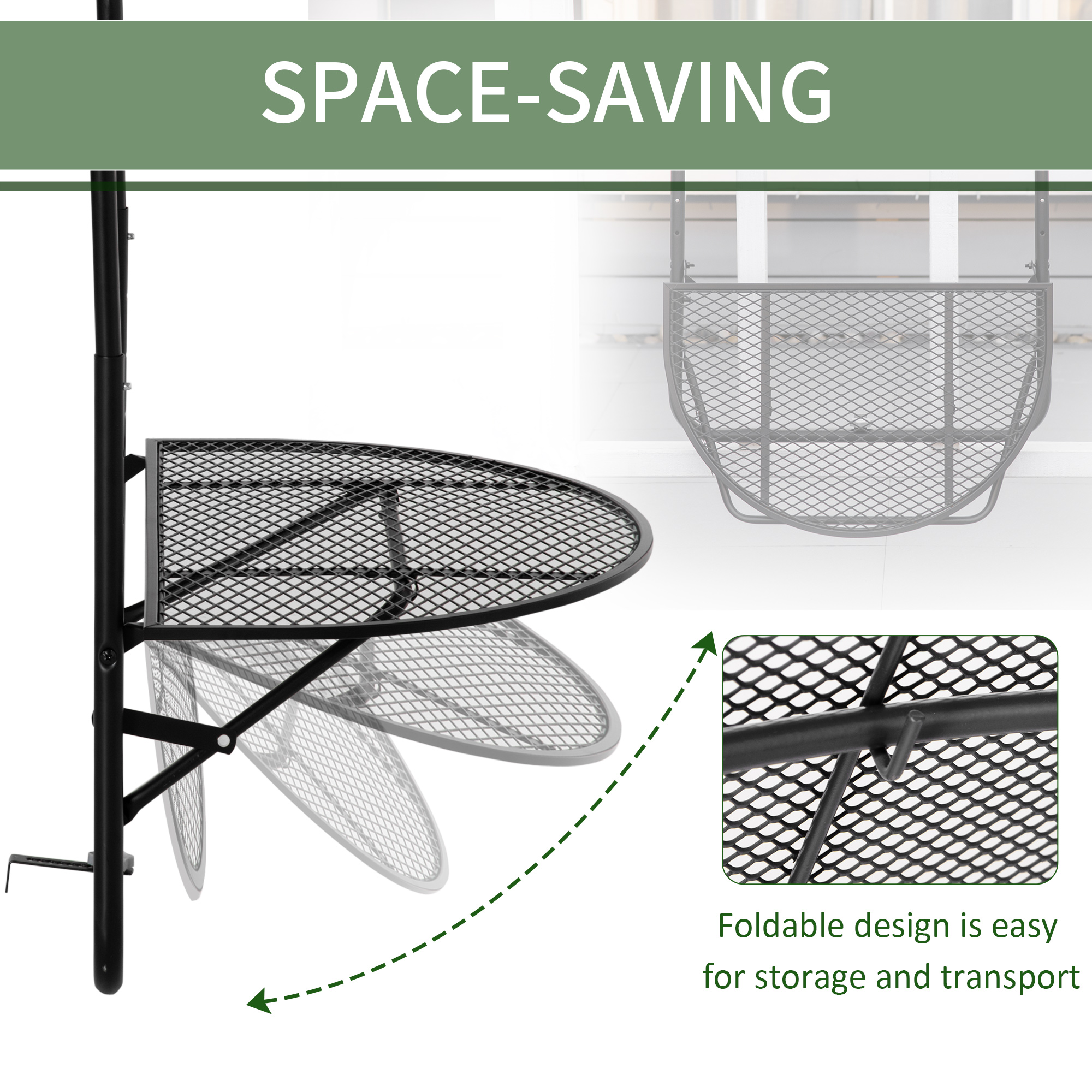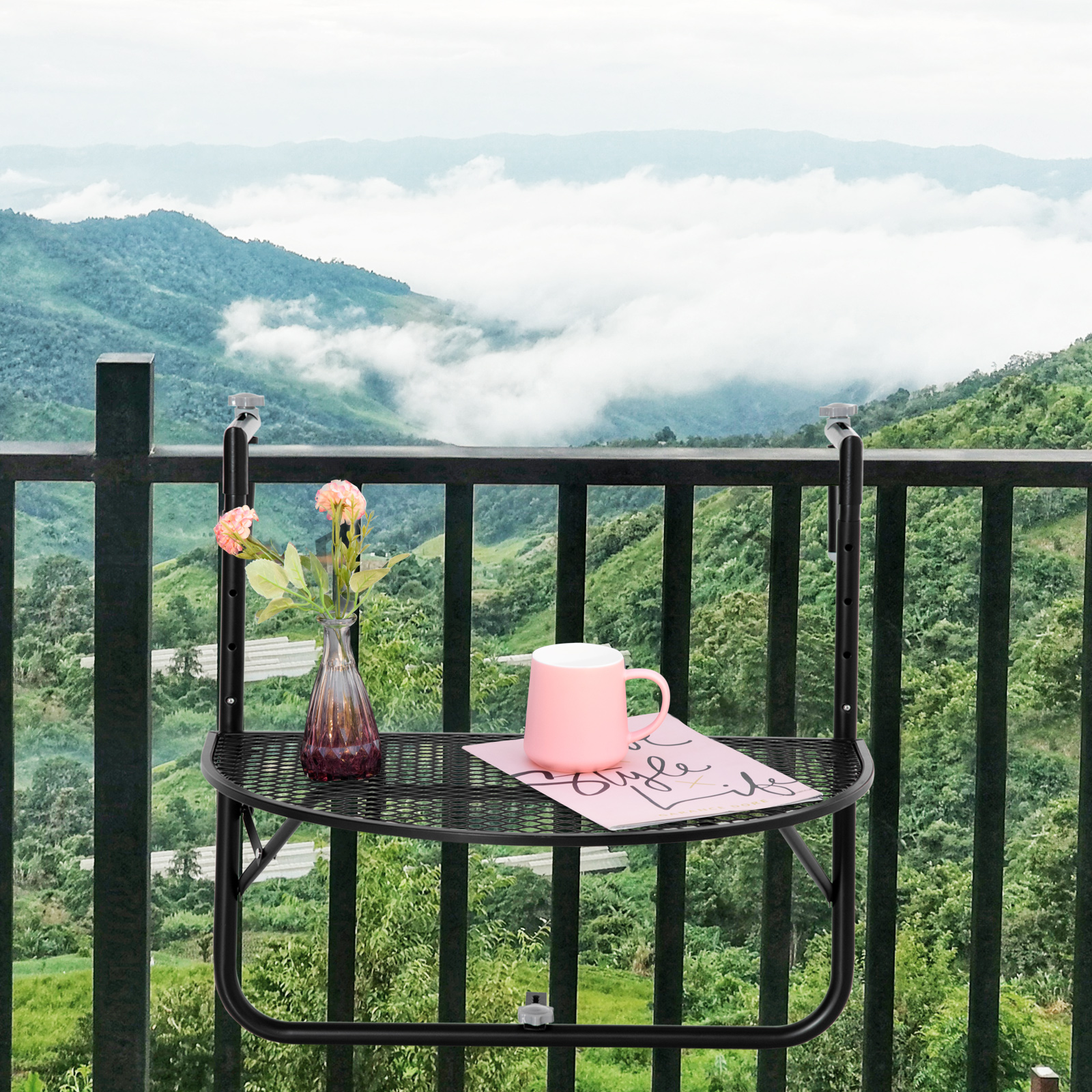 Relaxati-va pe balcon si bucurati-va de o cafea, un ceai sau un fel de mancare cu aceasta masa de balustrada din metal de la [BRAND NAME]! Aceasta masa ofera o solutie excelenta pentru oricine are un spatiu limitat in aer liber. Fabricata din cadru metalic cu finisaj negru, acesta poate satisface nevoile de utilizare zilnica. Cu o pozitie reglabila de fixare pe balustrada si patru pozitii reglabile pentru inaltimea blatului, se poate atasa cu usurinta pe balustrada terasei sau balconului dumneavoastra. Cu acest dispozitiv inteligent, nu veti varsa niciodata o bautura in timp ce va bucurati de privelistea de pe balcon.