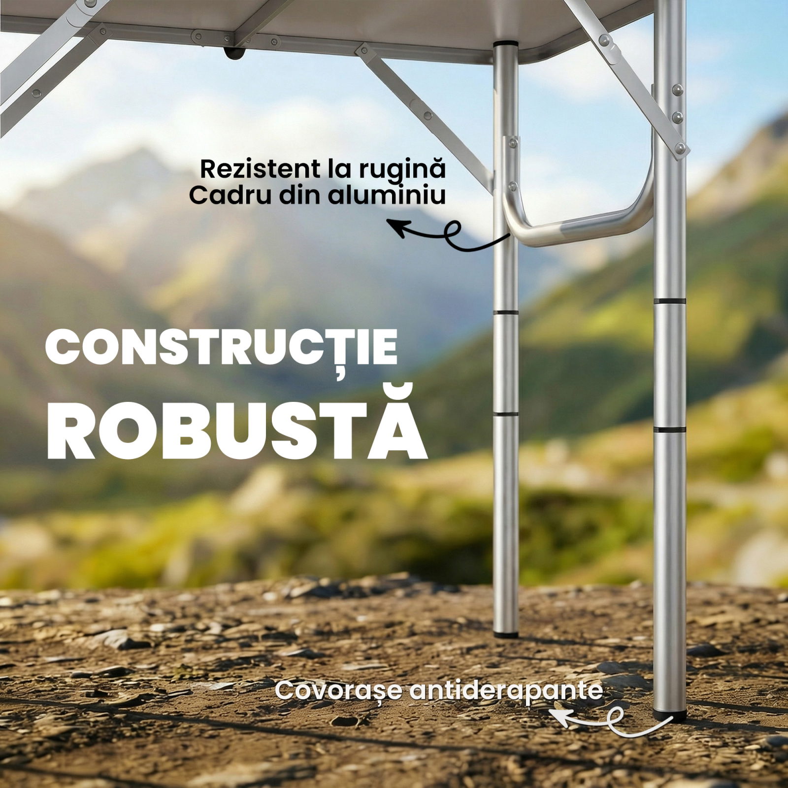 Transforma-ti aventurile in aer liber cu masa pliabila [BRAND NAME]! Datorita designului pliabil, manerului si celor 4 inaltimi reglabile, este ideala pentru picnicuri, gratare sau zile la plaja. Plasa integrata de sub masa ajuta la organizarea obiectelor esentiale. Usoara si practica, este partenerul perfect pentru activitati in aer liber fara efort.