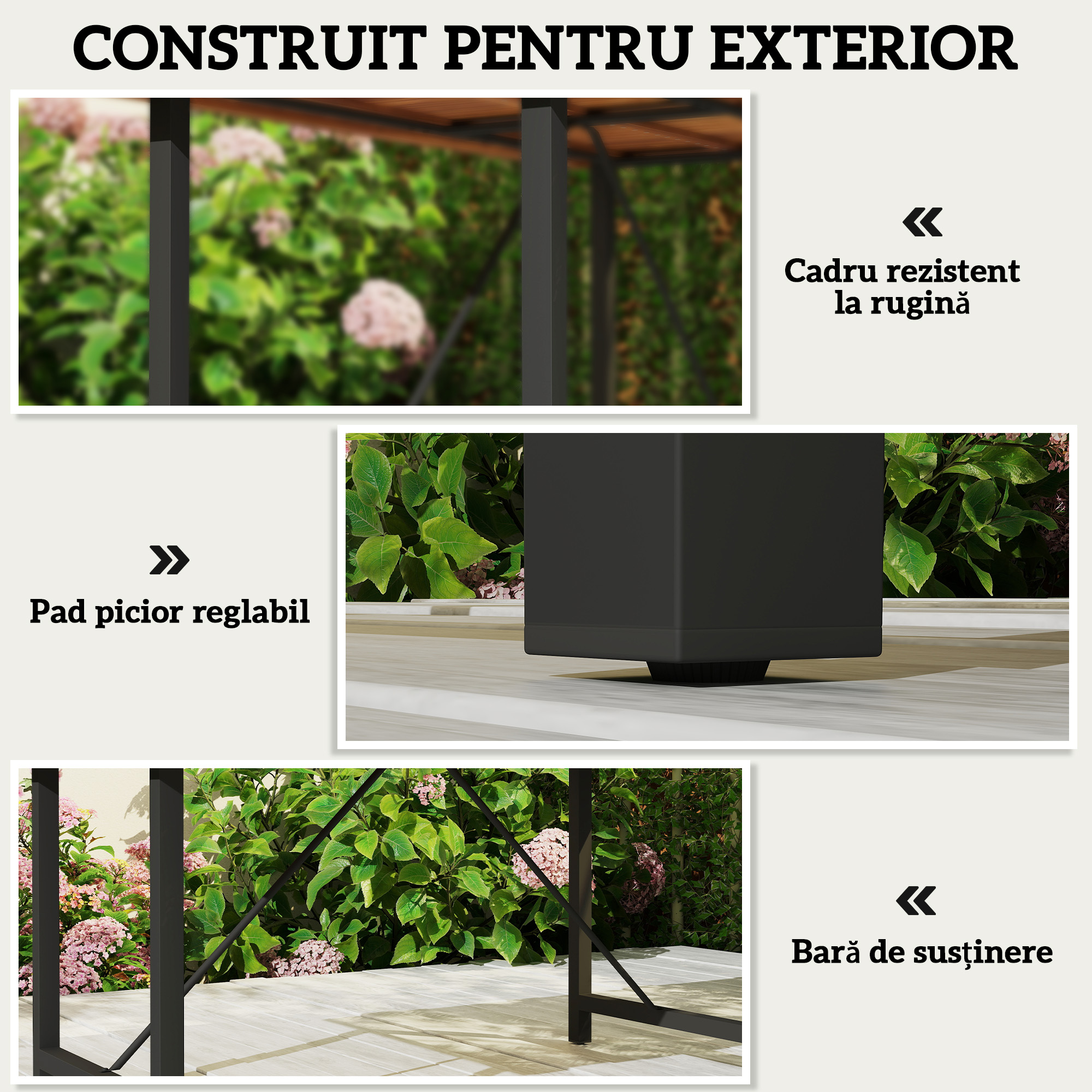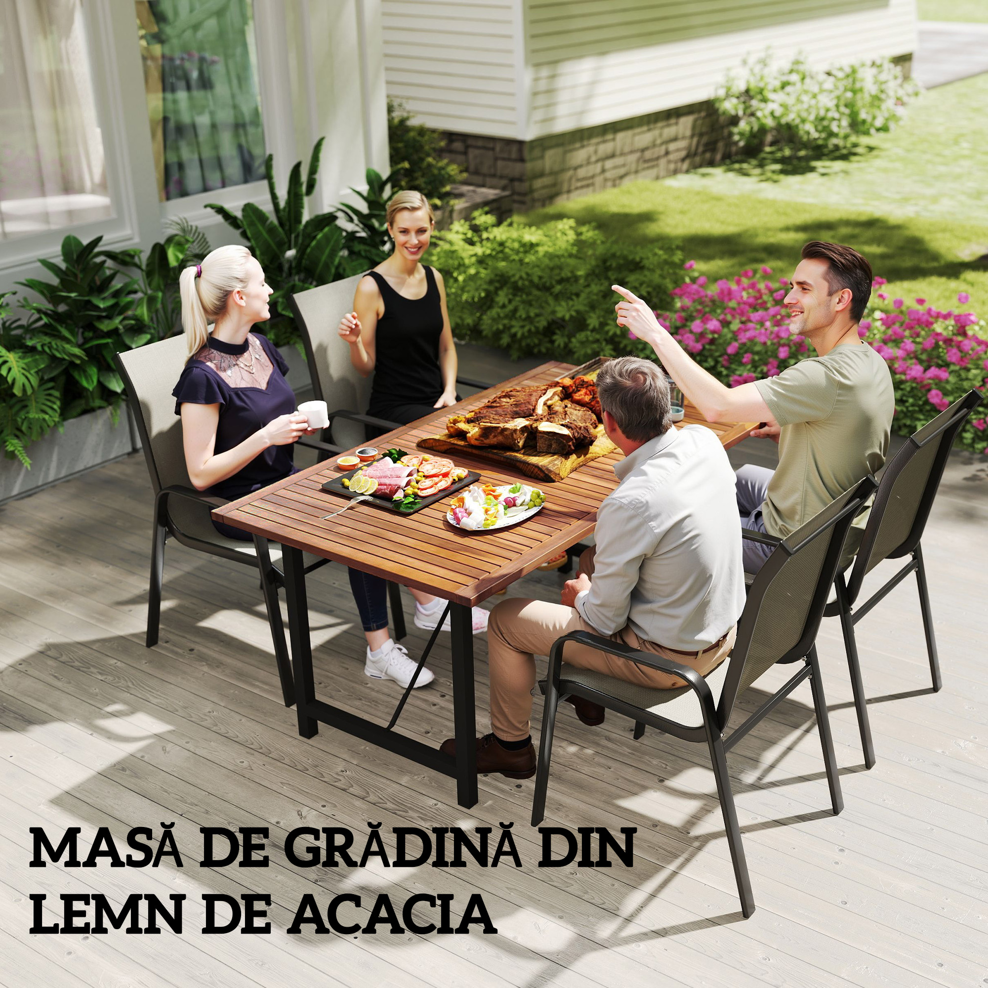 Reinnoieste spatiul exterior cu masa de pranz [BRAND NAME]. Fabricata din lemn de salcam cu tratament de vopsire, aceasta masa de pranz pentru exterior imbina eleganta cu practicitatea. Structura din otel este anti-rugina, pentru a rezista la intemperii si a-ti asigura o durata lunga de utilizare in spatiile tale in aer liber.
