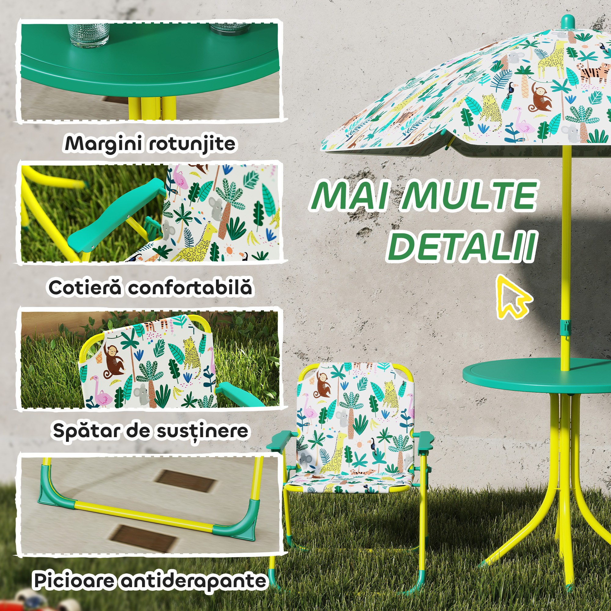 Acest set de gradina cu tematica jungla de la [BRAND NAME] pentru 2 copii stimuleaza imaginatia celor mici si sustine ore de joaca creativa, gustari in companie si momente de relaxare impartasite. Fiecare piesa din set este usor de mutat sau transportat, permitand copiilor sa isi creeze propriul colt personal oriunde merg, transformand orice moment intr-unul distractiv, captivant si plin de aventuri.