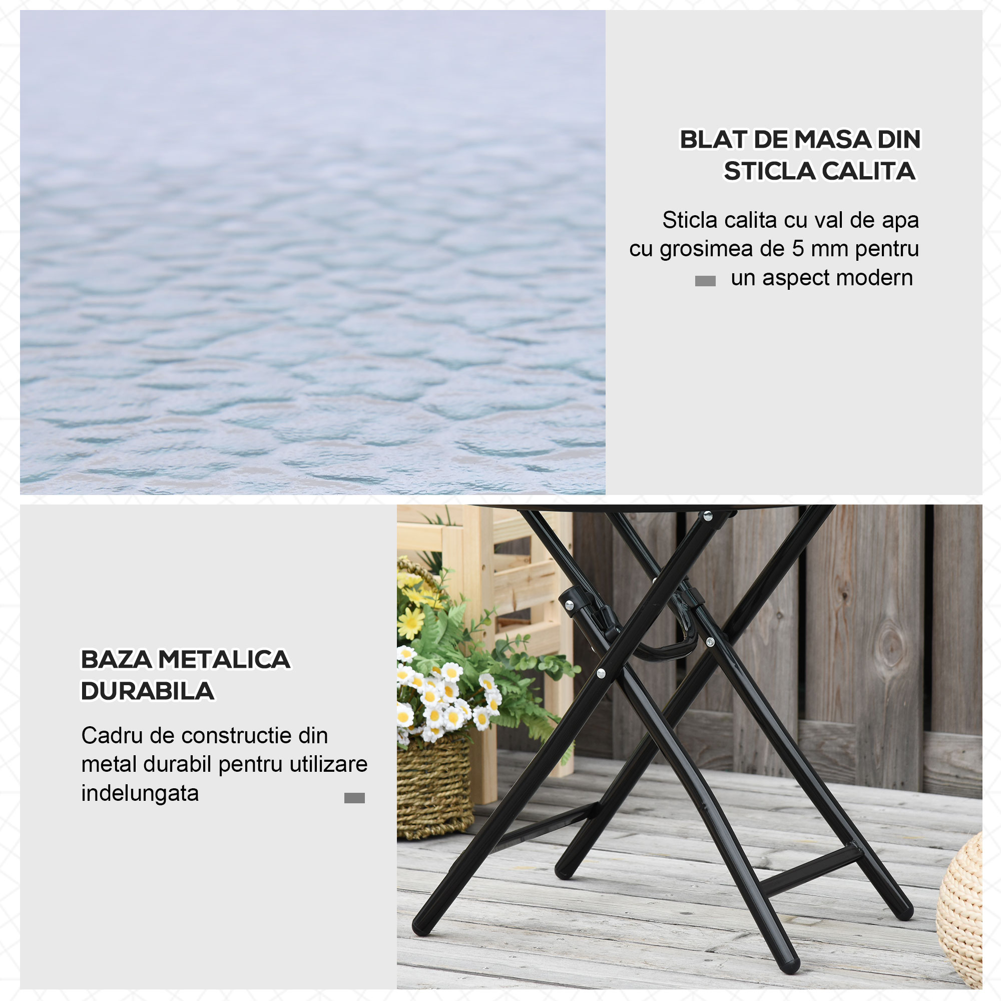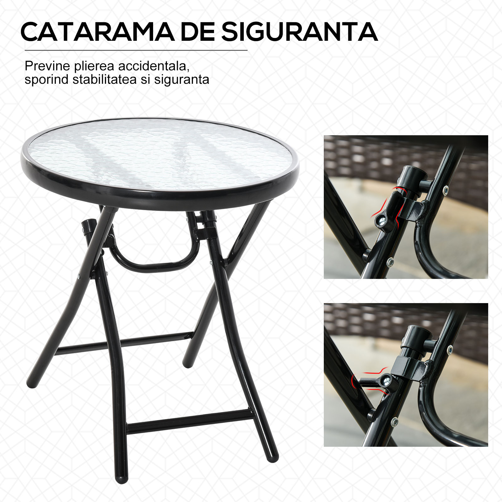 Spatiul de care dispuneti nu este unul foarte generos? Atunci tineti cont ca nevoia de a adauga o masa in decor poate fi mai bine pusa in aplicare cu [BRAND NAME] masa pliabila pentru gradina, blat sticla, neagra. [BRAND NAME] masa pliabila pentru gradina, blat sticla, neagra este usor si rapid de pliat, de demontat, depozitat si transportat. Combina stilul practic si functional cu cel elegant, astfel incat surclaseaza tipurile clasice de mese pliabile. Blatul sau de sticla este gros si rezistent si ii da o nota de eleganta. Gandita practic, aceasta dispune si de sistem anti accident pentru pliere. O incuietoare pe unul din picioarele de sustinere ale mesei poate fi actionata si previne inchidere accidentala. [BRAND NAME] masa pliabila pentru gradina, blat sticla, neagra este creata cu maxima precizie incat sa va avantajeze, in sensul in care dispune de: margini finisate, de picioare suport rotunjite incat sa nu zgarie suprafetele, sticla groasa de 5 mm si per total un stil modern.