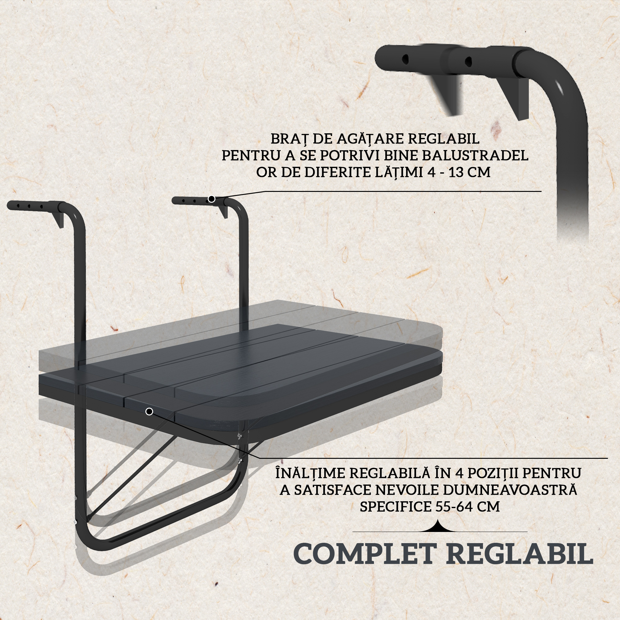 Relaxeaza-te pe balcon si bucura-te de o bautura cu aceasta masa de bar pentru balcon de la [BRAND NAME]! Aceasta masa este solutia ideala pentru cei care dispun de un spatiu exterior limitat. Fabricata dintr-un cadru din aluminiu si un blat din plastic cu efect de lemn, este proiectata pentru utilizare frecventa zilnica. Cu brate reglabile pentru balustrada si 4 pozitii reglabile pentru inaltimea blatului, se adapteaza usor terasei sau balconului tau. Bucura-te de privelistea de pe balconul tau!