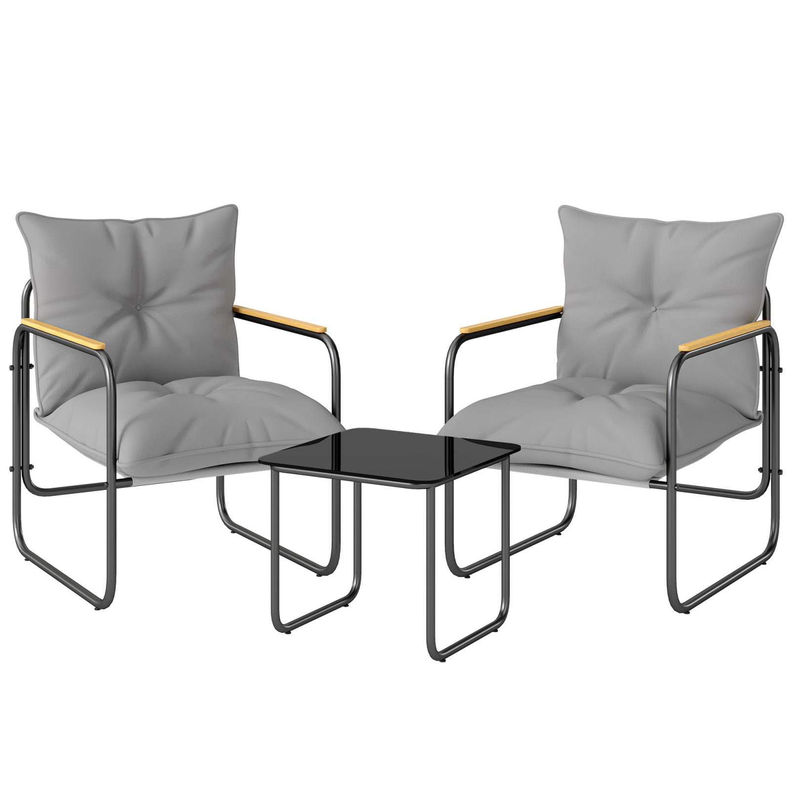 Bucura-te de momente linistite si insorite cu setul bistro [BRAND NAME] de 3 piese. Relaxati-va pe pernele groase pozitionate pe sezuturi respirabile din textiline in timp ce savurati cafeaua, cititi sau conversati confortabil. Cadrul metalic acoperit cu pulbere al setului de masa si scaune pentru balcon ofera stabilitate, in timp ce masa cu blat de sticla elegant pastreaza bauturile si gustarile la indemana, creand o oaza relaxanta pentru utilizarea zilnica in aer liber.