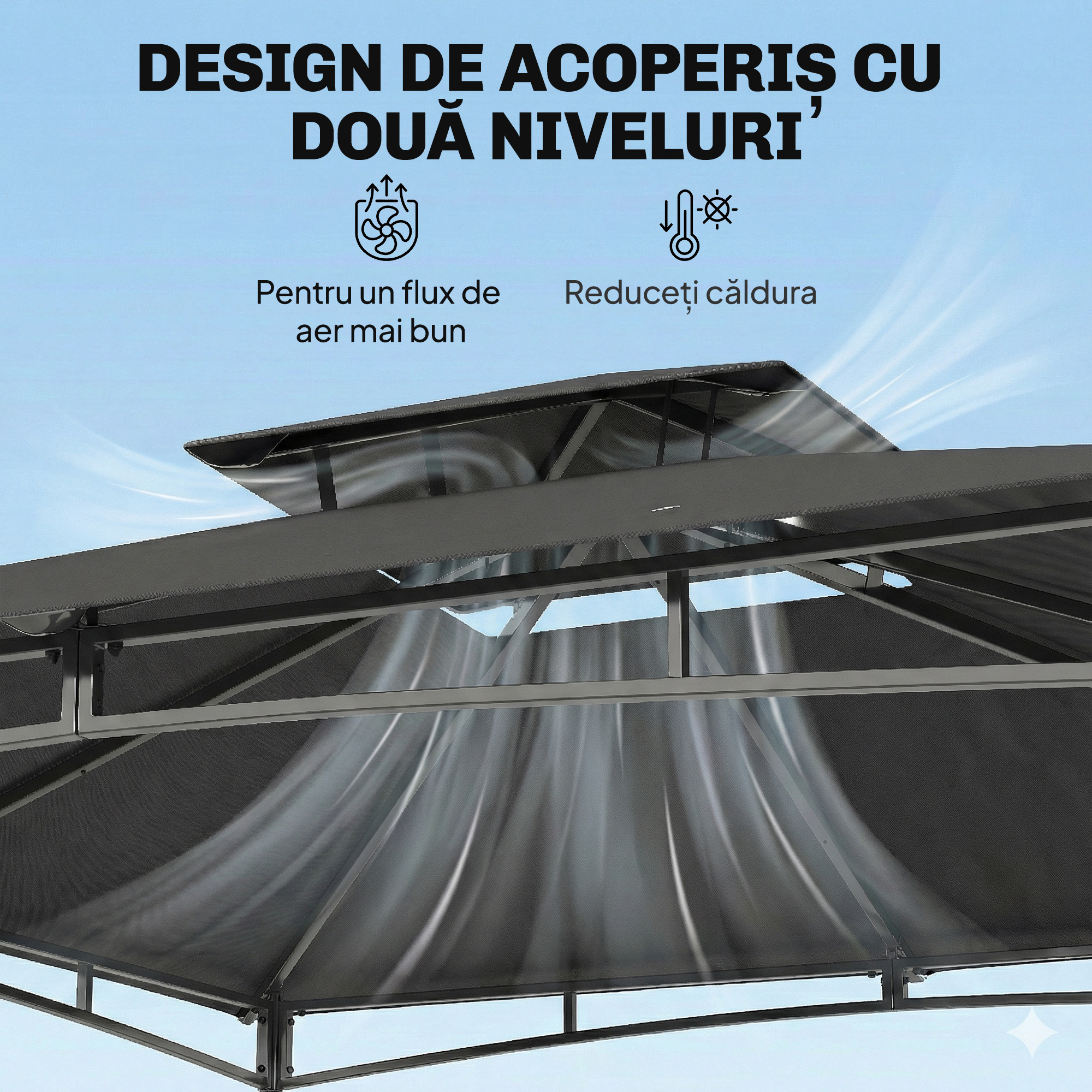Transforma-ti spatiul exterior cu pavilionul [BRAND NAME]! Fabricat din poliester de 180 g/m² impermeabil si anti-UV UPF 50+, are o structura din metal rezistenta la rugina. Acoperisul cu strat dublu imbunatateste circulatia aerului, oferind confort in orice sezon. Perfect pentru intalniri sau relaxare, pavilionul de 3x3 m este refugiul ideal in aer liber.