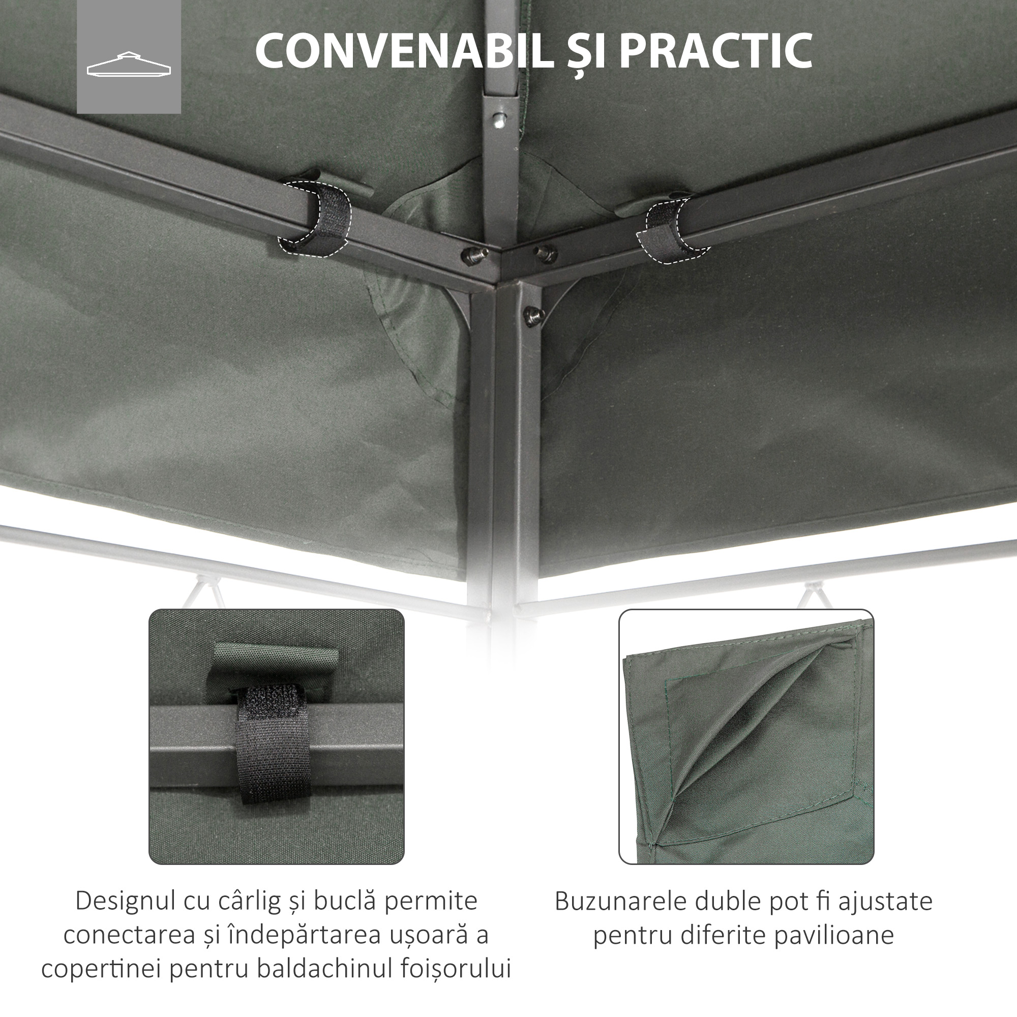 A oferi o noua viata foisorului dvs.va fi o joaca de copii datorita acestei prelate [BRAND NAME] practice si rezistente la apa. Fabricata din poliester de inalta calitate cu acoperire PA pentru a oferi durabilitate si protectie solara, structura are un acoperis cu 2 niveluri pentru a permite circulatia aerului in timpul utilizarii si 10 gauri pentru scurgerea apei. Copertina de schimb se potriveste cu foisoare de 3x4 m