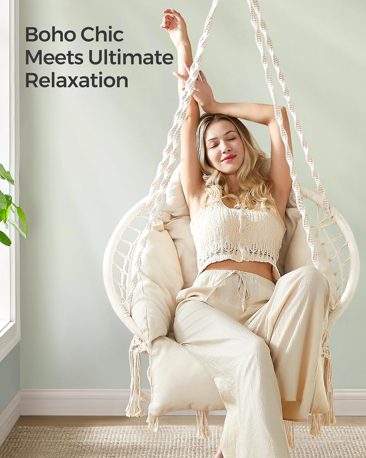 Scaun rotund tip leagan suspendat cu perna, stil boho ciucuri, franghie impletita, max 120 kg, L60 cm, bej