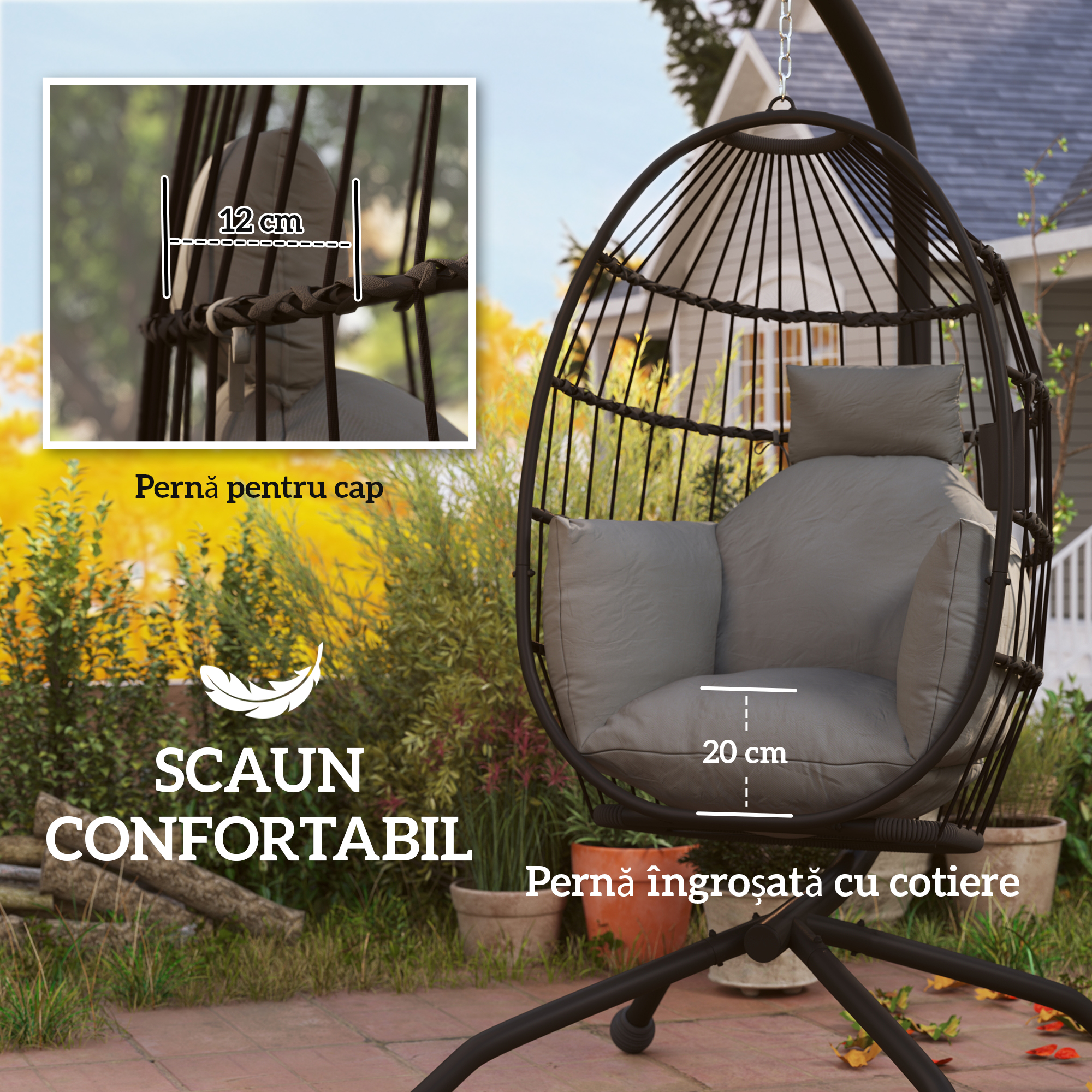 Relaxeaza-te in confort optim cu acest scaun in forma de ou pentru exterior de la [BRAND NAME]! Acest scaun de gradina in forma de ou, cu un design perforat impletit cu franghii, este ca un refugiu confortabil asemanator unui cuib de pasare. Cosul pliabil permite depozitarea usoara, cu un suport pentru pahar care iti pastreaza bautura la indemana. Perna de 20cm grosime cu cotiere si o perna separata pentru cap asigura un confort luxos. Cadrul din otel cu acoperire cu pulbere si baza in forma de X fac ca scaunul suspendat in forma de ou sa fie stabil.